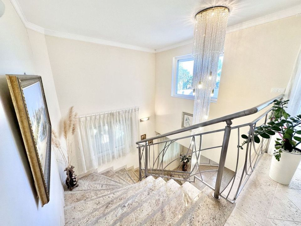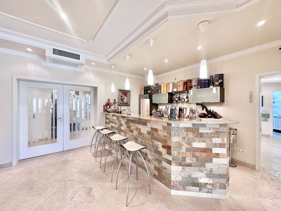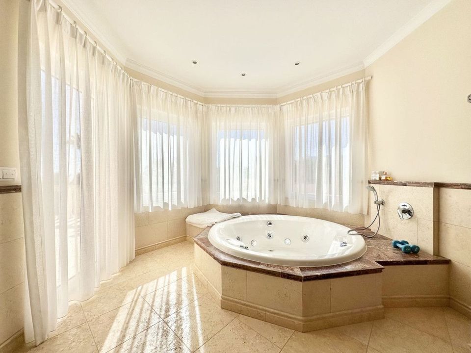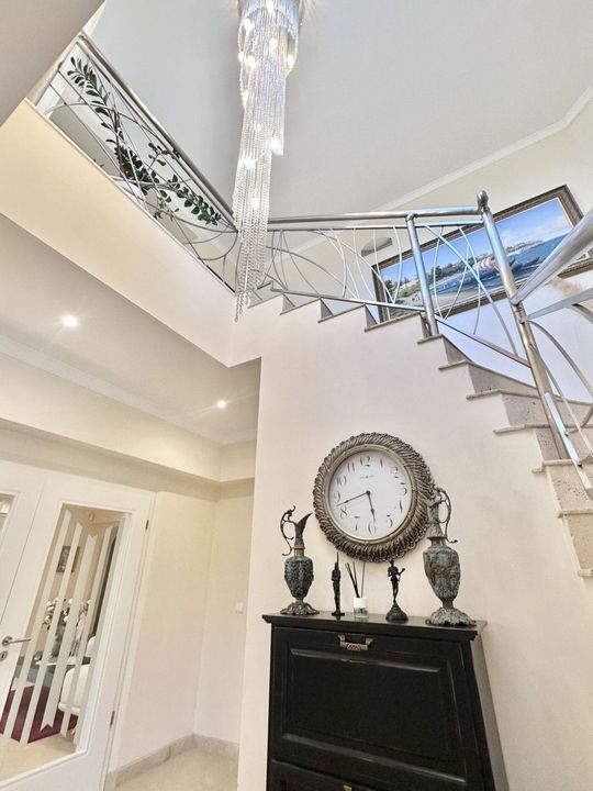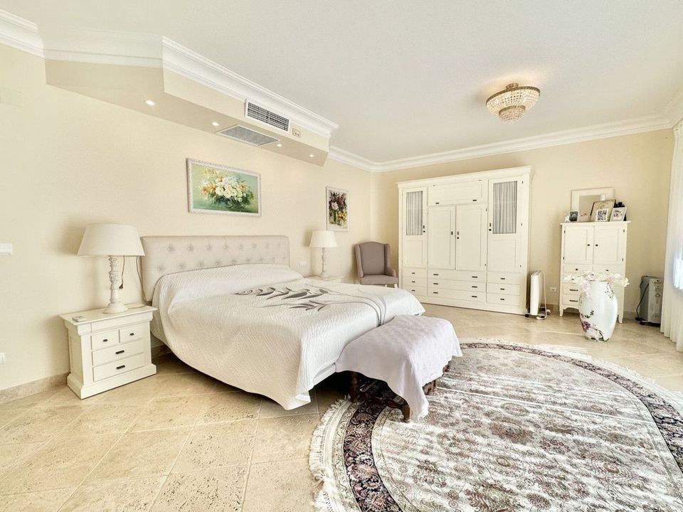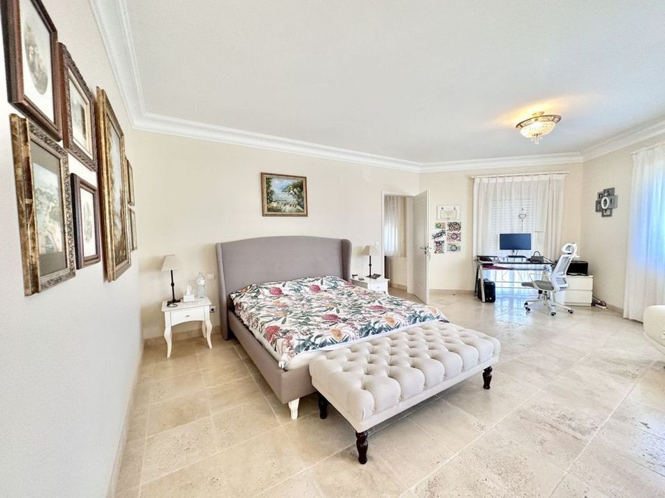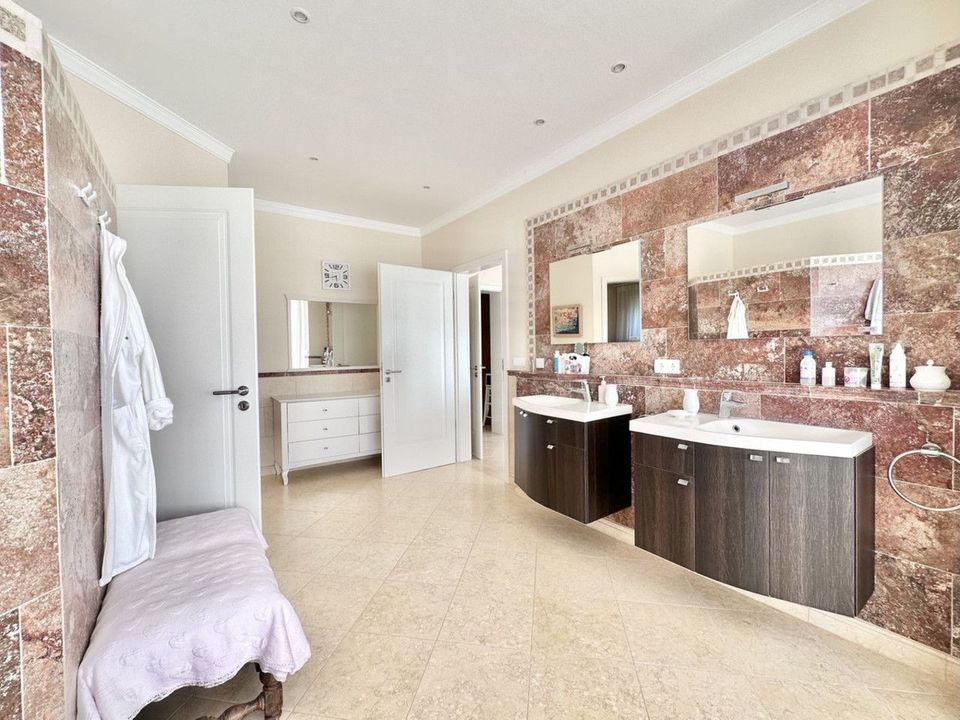 The villa consists of two floors, a total of 6 bedrooms and 5 bathrooms, there is a laundry room, a dressing room, several utility rooms, a large living room with a fireplace, a separate dining area with access to the terrace, a lounge with a bar counter and an entrance hall.