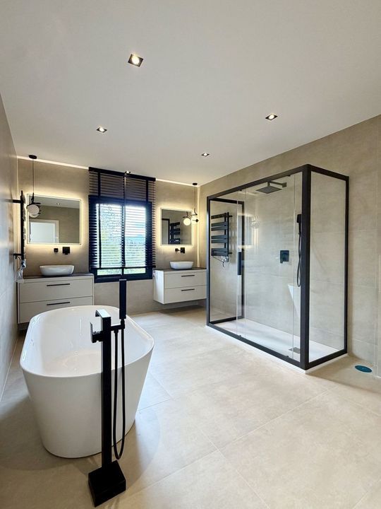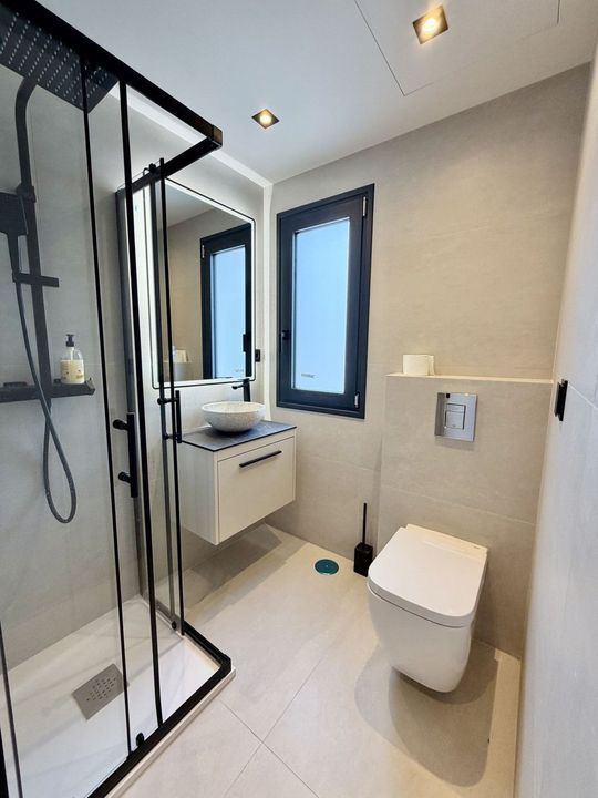 The lower floor comprises two additional bedrooms, two bathrooms, a multi-purpose room ideal as a cinema or leisure area, as well as a space fitted out for a sauna.