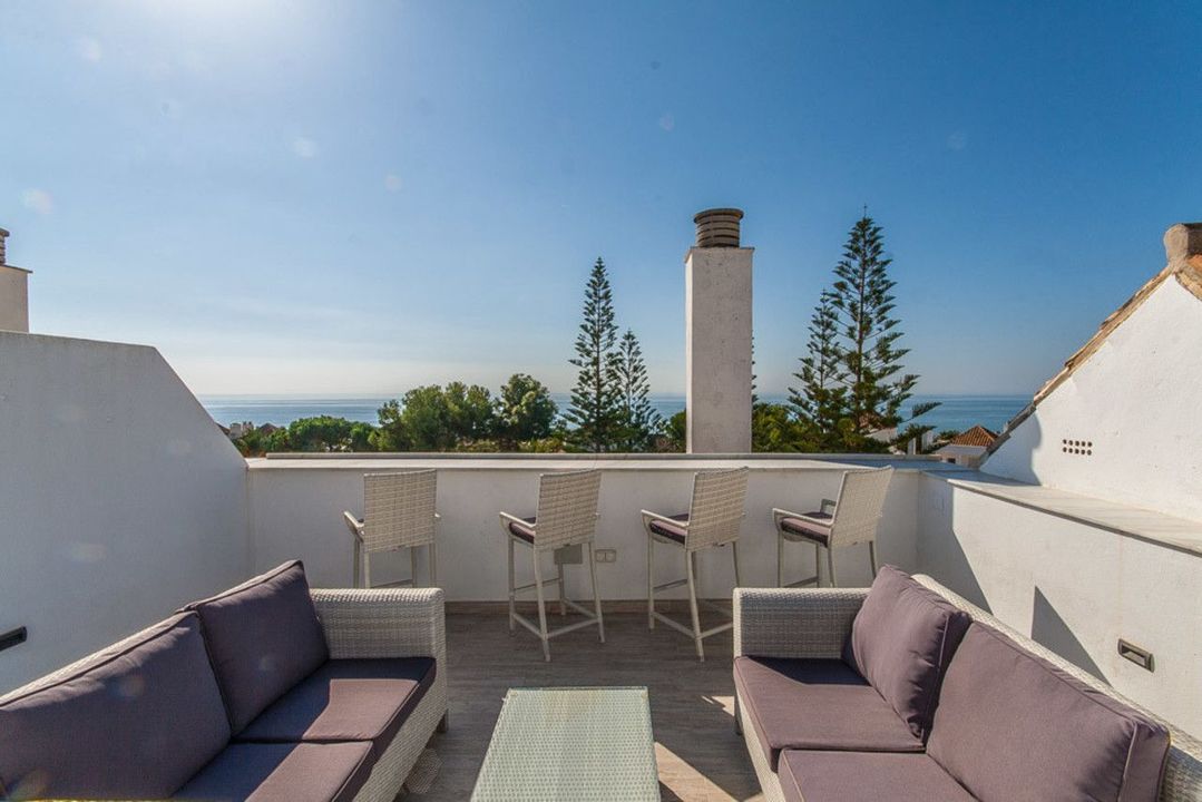 Immaculate, completely refurbished duplex penthouse in the popular beach urbanisation White Pearl Beach, just 150 meters from Elviria's best stretch of beach and walking distance to local shops, supermarkets, bars and restaurants. The lower levels consists of a three bedrooms and two bathrooms, a newly fitted kitchen with direct access to an ample terrace at the backside of the property with outside kitchen and barbecue, a bright and sunny lounge/dining area with fireplace and direct access to an ample south facing terrace with beautiful views of the mediterranean Sea, the communal gardens and pool. The upper floor offers a large bedroom with en-suite bathroom and another spacious terrace with jacuzzi and beautiful sea views. Arguably the best penthouse for sale in the development, this property is offered with all the furniture included and is ready to move in to. The community if fully gated, offers underground parking and has 24-hour security.
