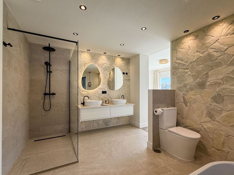 De eerste verdieping biedt een prachtige master bedroom met ensuite badkamer, inloopkast en een terras met uitzicht op de golfbaan en de bergen – een perfecte plek om rustig wakker te worden met een kop koffie. Daarnaast zijn er nog twee ruime slaapkamers die een moderne badkamer delen.