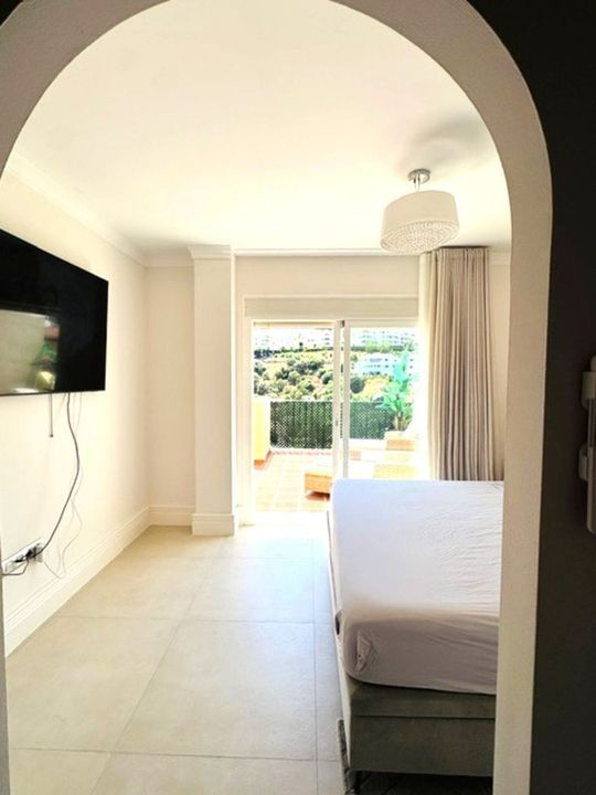 This property is the finest, completely renovated penthouse in La Cala Hills and the surrounding areas. Everything in this property has been upgraded and modernised, from the new tiled flooring to the bathrooms, kitchen, internal doors and wardrobes in all three bedrooms. This is the most quintessential "turn key" penthouse you will ever find. This spacious three bedroom, two bathroom penthouse is located in La Cala Hills, Mijas Costa. With 118m² of interior living space and a 104m² wraparound terrace (on three sides), there is always a sunny or shaded spot to enjoy throughout the day. Situated in Phase IV, the terrace offers panoramic views of the surrounding landscape, and the communal garden with swimming pool. The generous outdoor space is one of the main highlights of this property, as is the glass curtained conservatory, which you can enjoy all year round. Inside the apartment the newly renovated kitchen is now open plan into the lounge where you will find a comfortable seating area with built in fire place and TV and an adjacent dining area. Both areas have direct access to the open terrace so they are flooded with natural light and fresh air and the dining area also has direct access to the conservatory. The master bedroom has a modern and elegant en-suite shower room and there is another shower room for the occupants of bedrooms two and three. The kitchen is fully equipped and leads to a separate utility/laundry room with the washer and dryer conveniently hidden in a sleek cupboard. The property also includes a private storage room and a parking space in the underground garage and there is additional guest parking inside the community gates. A comfortable and well-located home for those looking for space, views, and outdoor living in a peaceful yet accessible area.