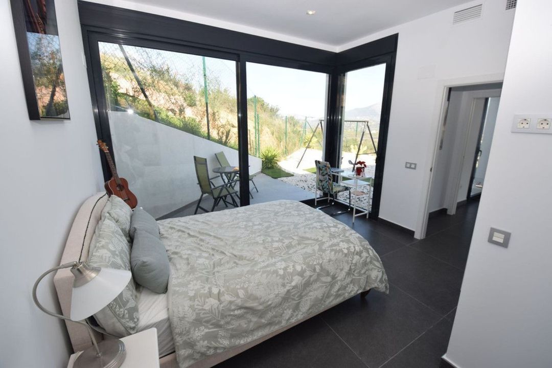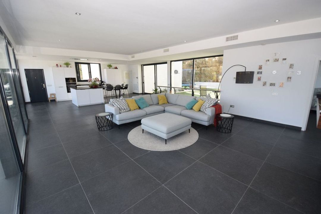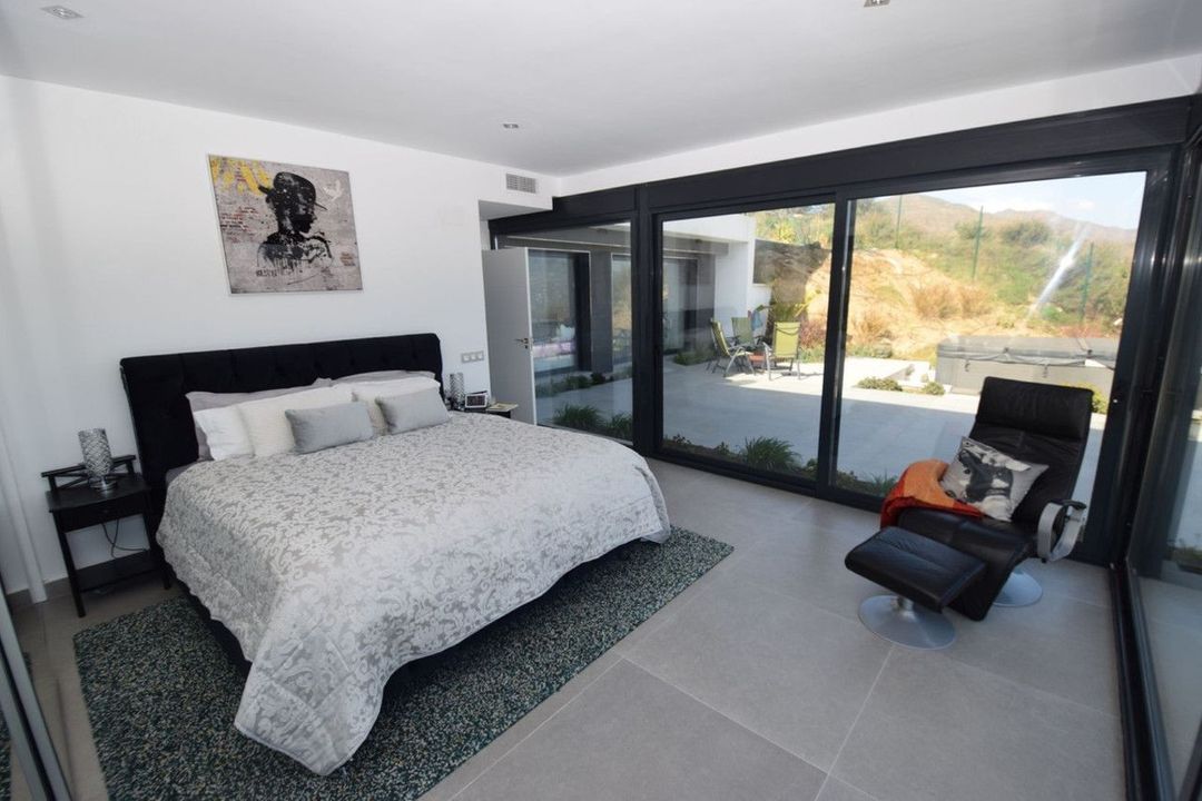 Fantastic contemporary villa located on the world renowned La Cala Golf Resort with breathtaking views of the surrounding countryside and all the way up to Mijas Pueblo. Entering the villa you are presented with a very impressive, open plan kitchen / lounge / dining area with a central island in the kitchen and a fire place in the lounge area. Both sides of this beautiful living space have floor to ceiling windows to ensure the property is flooded with natural light all day long. Also on this level is a guest bedroom with ensuite shower room and direct access to a private terrace. From the kitchen area you have direct access to a large open terrace, a perfect area to enjoy the expansive views over some lunch or possibly a nice cool glass of wine. There is also a double garage with direct access to the kitchen and a rear terrace with artificial grass beautifully set up as a childrens play area with various activities. From the lounge area you access the lower level via the floating staircase where there is a cosy sitting area with fitted wardrobes, two guest bedrooms that share a bathroom with a sunken bath and finally a wonderful master bedroom with floor to ceiling windows on two sides and an impressive ensuite shower room. All the bedrooms have fitted wardrobes, electric shutters and direct access to the outside terraces. Both floors of the villa have independent hot and cold air conditioning to ensure you can maintain the perfect temperature all year round. On the lower terrace there is a heated six meter Jacuzzi swimspa, perfect for exercising or relaxing, depending on your mood. If you prefer a swimming pool it is possible to replace the Jacuzzi with one. The villa is accessed via a large driveway where there is parking for several cars. La Cala Golf Resort has three 18 hole golf courses, a golf academy and practice range, club house, hotel and spa, restaurant and tennis courts, all easily accessible from this wonderful villa.