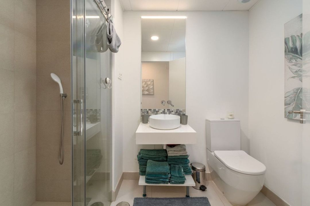 The two spacious en-suite bedrooms offer a tranquil and relaxing space and are designed with great attention to detail, for example the walk-in closet in the master bedroom. The large windows let in plenty of natural light and offer panoramic views of the surroundings as well as direct access to the terrace.