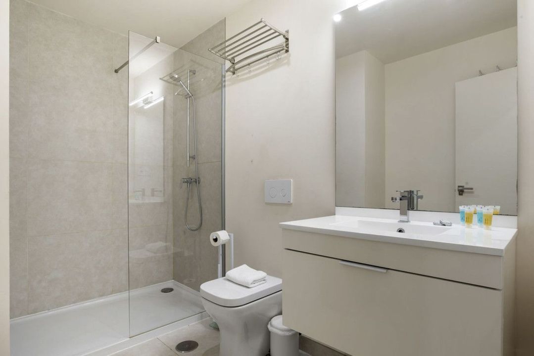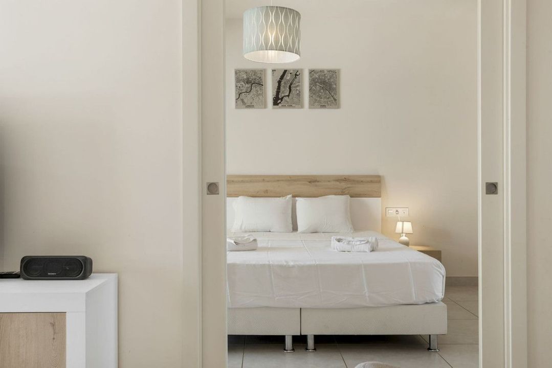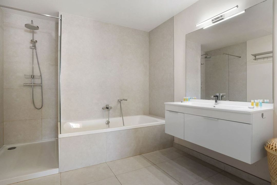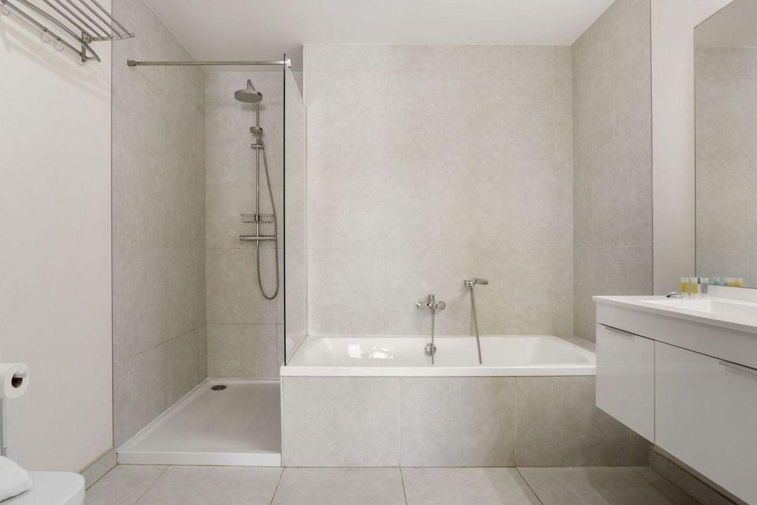 Bij binnenkomst bevinden zich aan de achterkant van het appartement twee slaapkamers met inbouwkasten en een badkamer. Allebei de slaapkamers hebben toegang tot een klein terras.