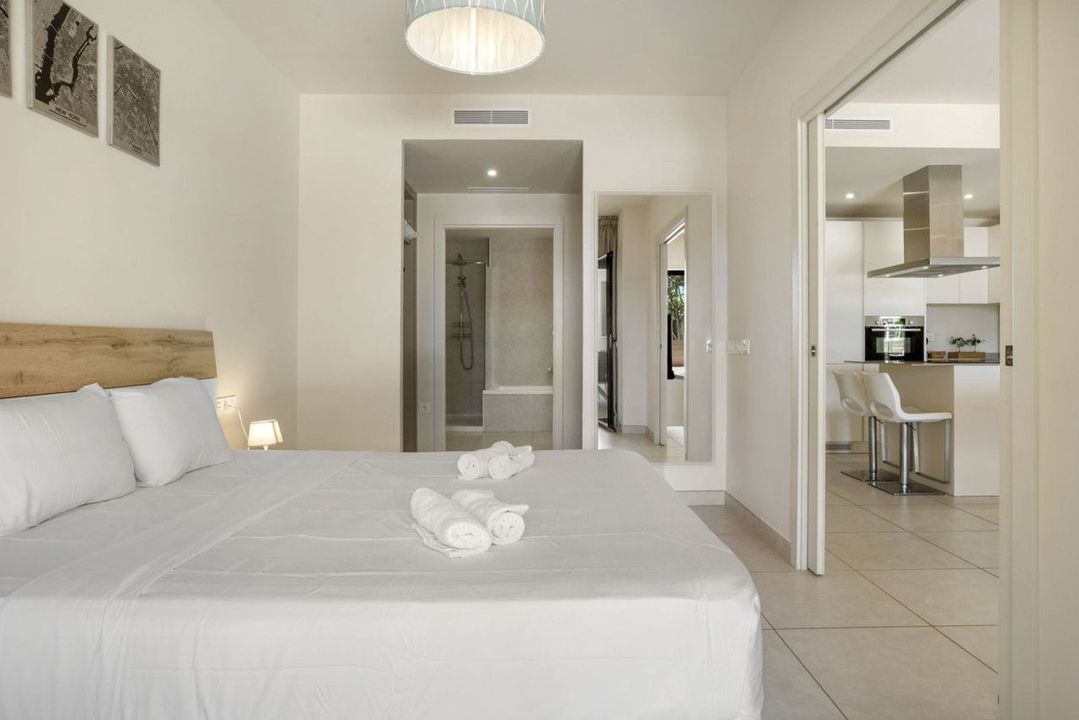 Vanuit de woonkamer kan je naar de master bedroom. Een ruime slaapkamer met inbouw- en inloopkasten en een eigen luxe badkamer . Vanuit deze slaapkamer is er ook toegang tot het terras.