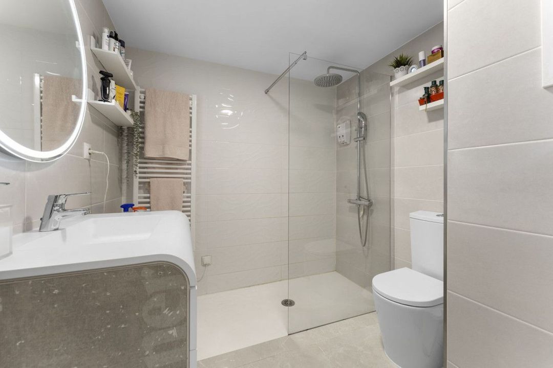 De master suite is een waar toevluchtsoord. Gelegen op de benedenverdieping, beschikt deze over een elegant ontworpen badkamer, een ruime indeling, ingebouwde kasten en volledige privacy. Direct naast de master bedroom en de badkamer bevindt zich een praktische was-/opbergruimte, wat het dagelijks leven vergemakkelijkt en directe toegang biedt tot de garage.