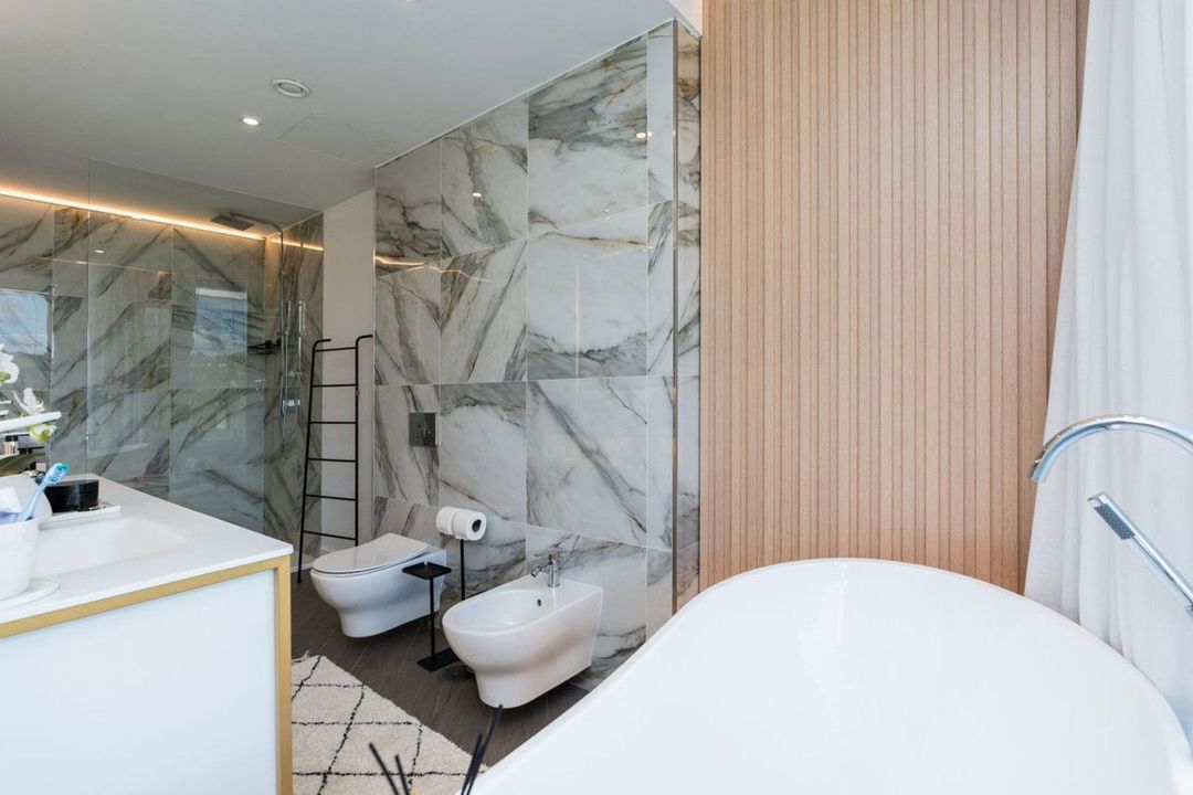 Walk in the front door and to the left of the front door you have a really nice stairway with a feature chandlier over two floors. Here you have a fabulous open plan kitchen/sitting/dining room with floor to ceiling windows and a picture through each one. Also on this floor you have a double bedroom ensuite and also another downstairs toilet. The sitting room leads out to a covered terrace. Upstairs you will find two more double bedrooms ensuite and one with an ultar modern design and layout. From the landing here you have Access to the solarium.