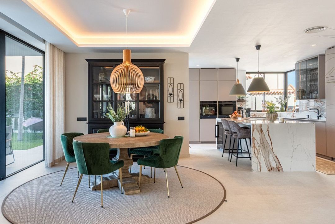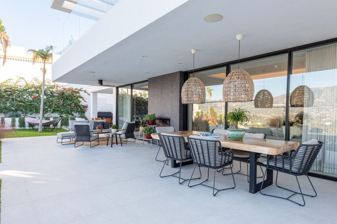 The exterior has been thoughtfully planned with multiple areas for dining, relaxing in the shade, or sunbathing by the heated infinity pool. The eco-friendly pool features an electric cover that harnesses solar energy to naturally warm the water.