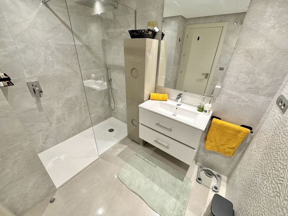 Hoofdslaapkamer met hoogwaardig behang, houten lambrisering in sommige delen, raam en deuren naar een groot zijterras, verborgen verlichting, veel inbouwkasten tot aan één wand en ook tegenover de ingang naar de luxe en-suite badkamer met douche, dubbele wastafels en toilet. Twee verdere ruime tweepersoonsslaapkamers met ramen, inbouwkasten, luxe behang op de muren. Tweede luxe badkamer met douche, wastafelmeubel, badkamer en hoogwaardige betegelde muren. Centrale airconditioning.