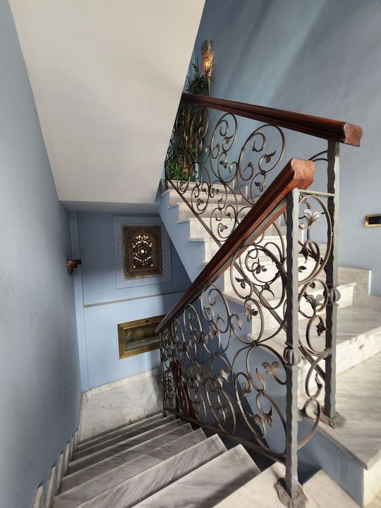 To the left, a sliding double door opens to a large, bright double living room with sea views and windows overlooking the side garden. The high ceiling is lined with hand-carved mahogany wood, adding an artisanal touch to the space. This floor also includes a bright bedroom with garden views and a marble bathroom, perfectly equipped.