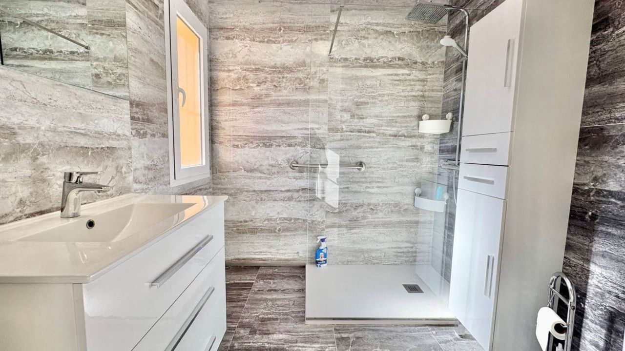 Binnenin ontdekt u een lichte, open leefruimte met directe toegang tot het terras en het zwembad. De villa telt drie slaapkamers en twee badkamers, allen gelijkvloers en praktisch ingedeeld. Hoewel de woning instapklaar is, kan u met enkele eenvoudige ingrepen een hedendaagse upgrade realiseren – ideaal voor wie houdt van een persoonlijke touch.