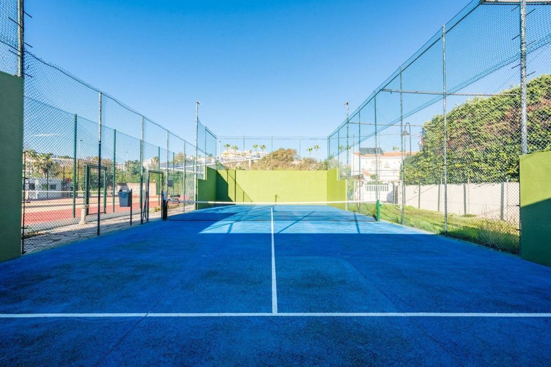 Large communal gardens, two swimming pools, tennis and padel courts, community office and clubhouse.