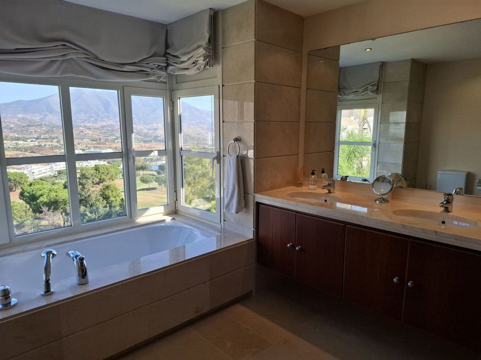 • 3 full bathrooms, with top quality marble tiles, main bathroom with underfloor heating, huge shower and Jacuzzi with Golf and sea views.