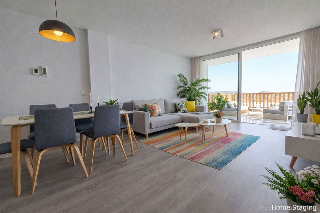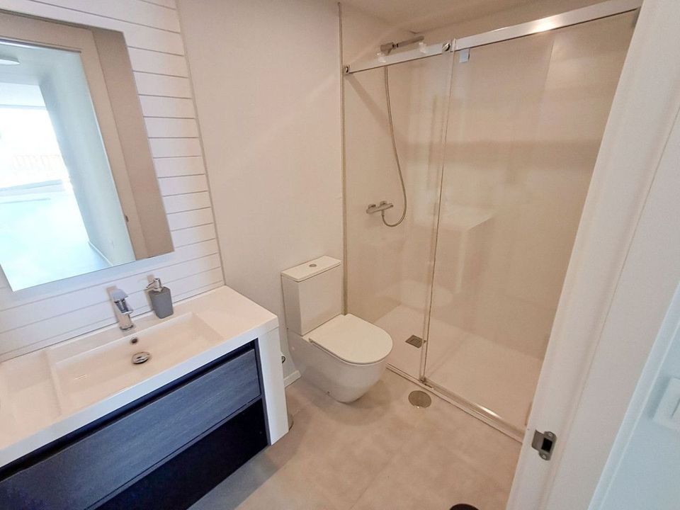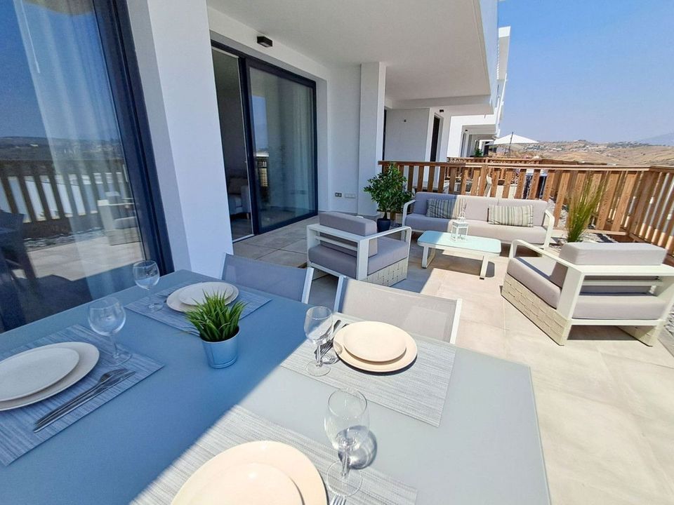 Het pand verwelkomt u bij de ingang met een lichte, moderne open keuken, die vervolgens leidt naar de woon-eetkamer. Vanuit de woonkamer heeft u toegang tot het prachtige terras met zeezicht, perfect voor zonliefhebbers die van het buitenleven willen genieten in het mediterrane klimaat. Alles met een subtiel en elegant design, ideaal om te rusten en te ontspannen.