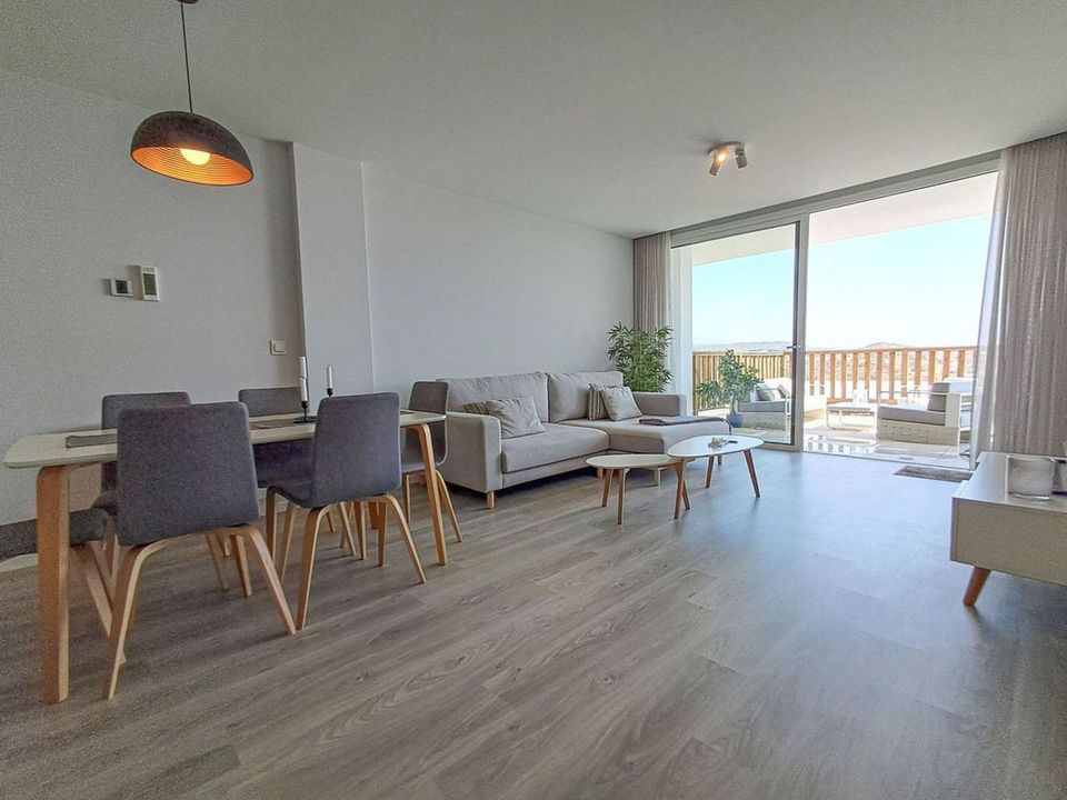 Het appartement is gemeubileerd met hoogwaardige minimalistische meubels, in zachte kleuren die elegantie en rust uitstralen.