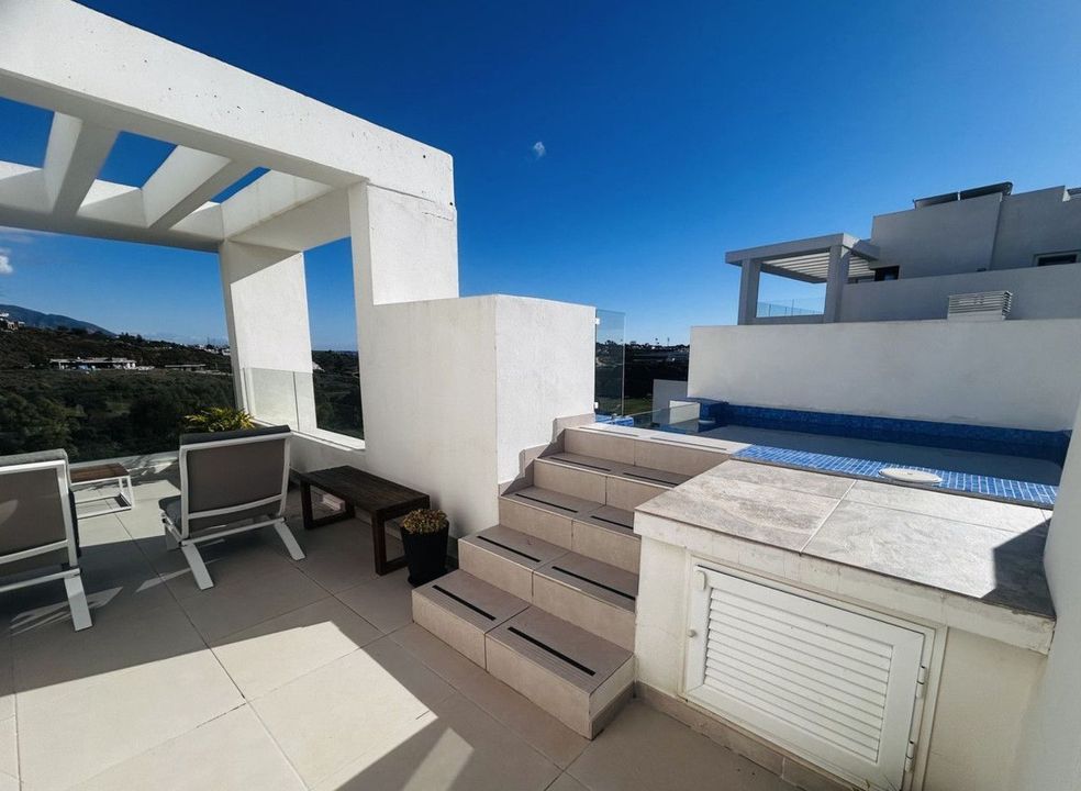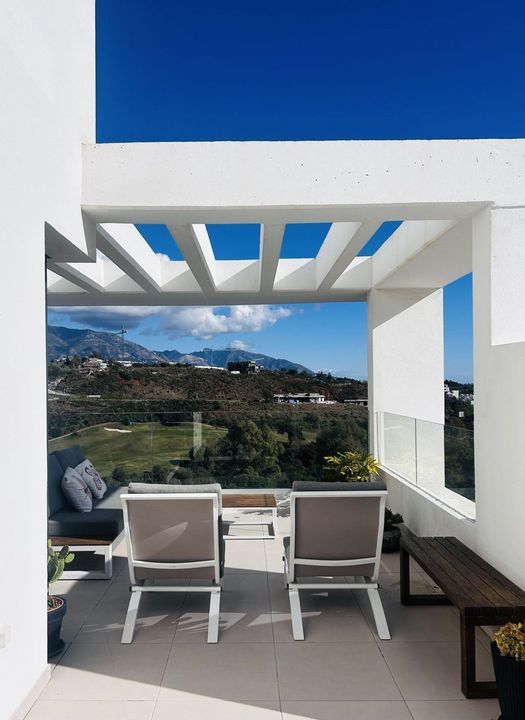 The penthouse is situated directly on the frontline of the famous "Campo America" golf course and offers breathtaking panoramic views of the mountains, golf courses and the Mediterranean Sea. It is distributed over 2 floors. On the main floor, the elegant living-dining area opens into a spacious terrace where sunrise become a masterpiece. The open-plan, fully equipped kitchen with Bosch electric appliances is designed for family meals and is complemented by practical utility cabinets. Two additional bedrooms offer comfort and privacy with a stunning view on the golf course and share the guest bathroom.