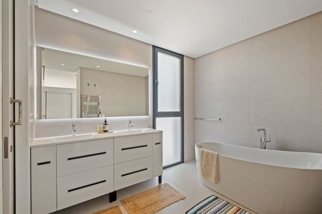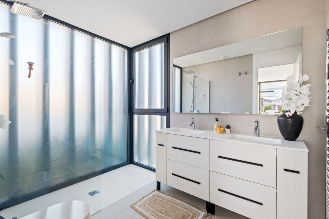 The villa also offers first-class modern amenities, such as underfloor heating, an automatic irrigation system, a heated pool, a water softener, a water tank, air conditioning in all rooms, and electric blinds and curtains.