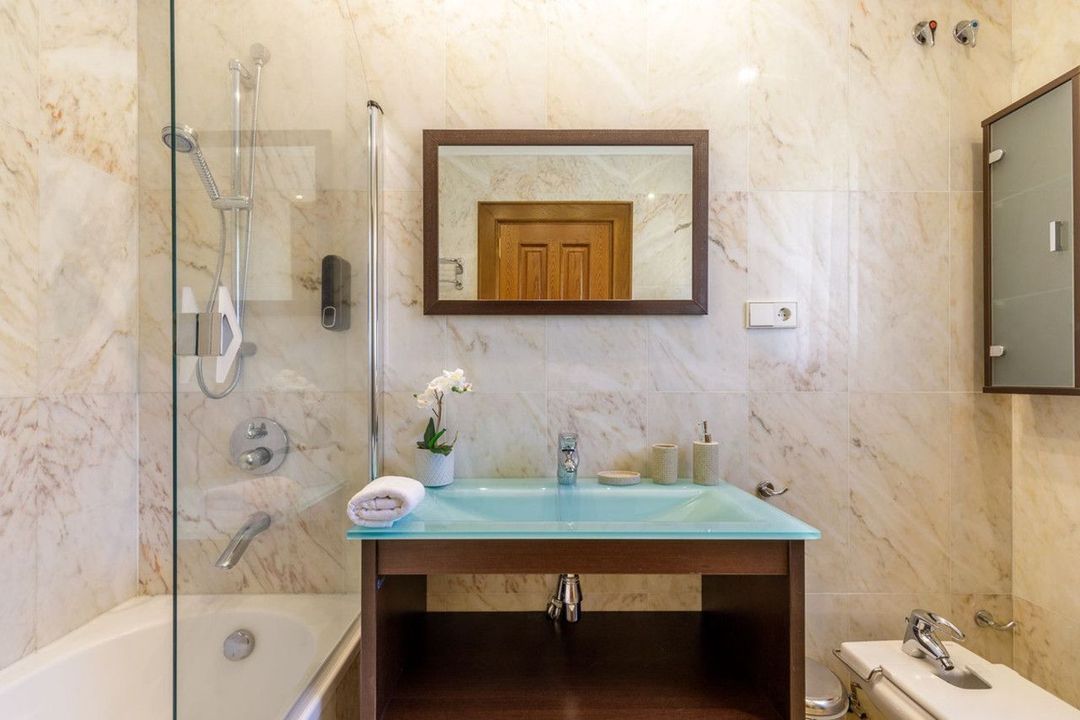 The ground floor consists of an entrance hall, living-dining room, kitchen-diner, 3 bedrooms with en-suite bathrooms, 1 guest toilet, laundry room, and storage room. The first floor consists of a hall, an office or bedroom, and a master bedroom with two separate dressing rooms, a bathroom with a Jacuzzi, shower, and sauna.