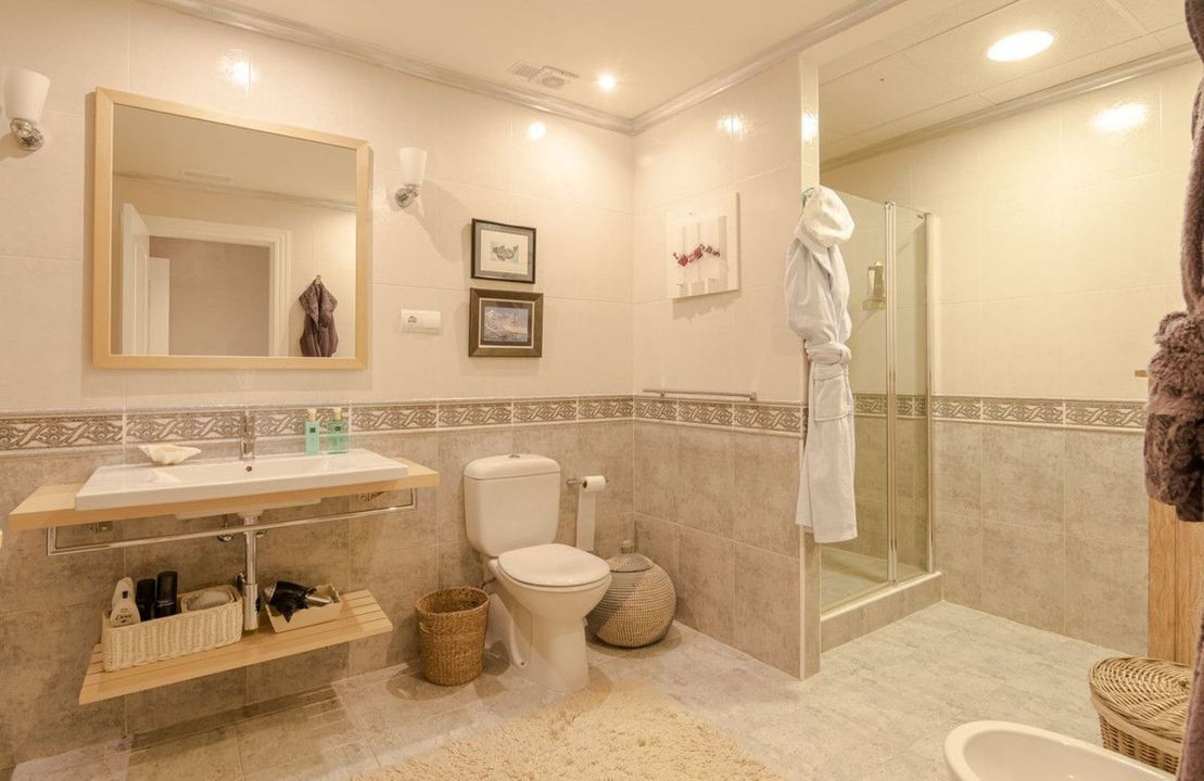 On the ground floor we have the basement area, which can be adapted for a games room, cinema, gym, whatever suits you best with more than 80 square meters and access to the garden, 3 bedrooms, one of them with an en-suite bathroom and another bathroom to share between both rooms. From this floor we have direct access to the Sauna area with a complete bathroom for the pool area.