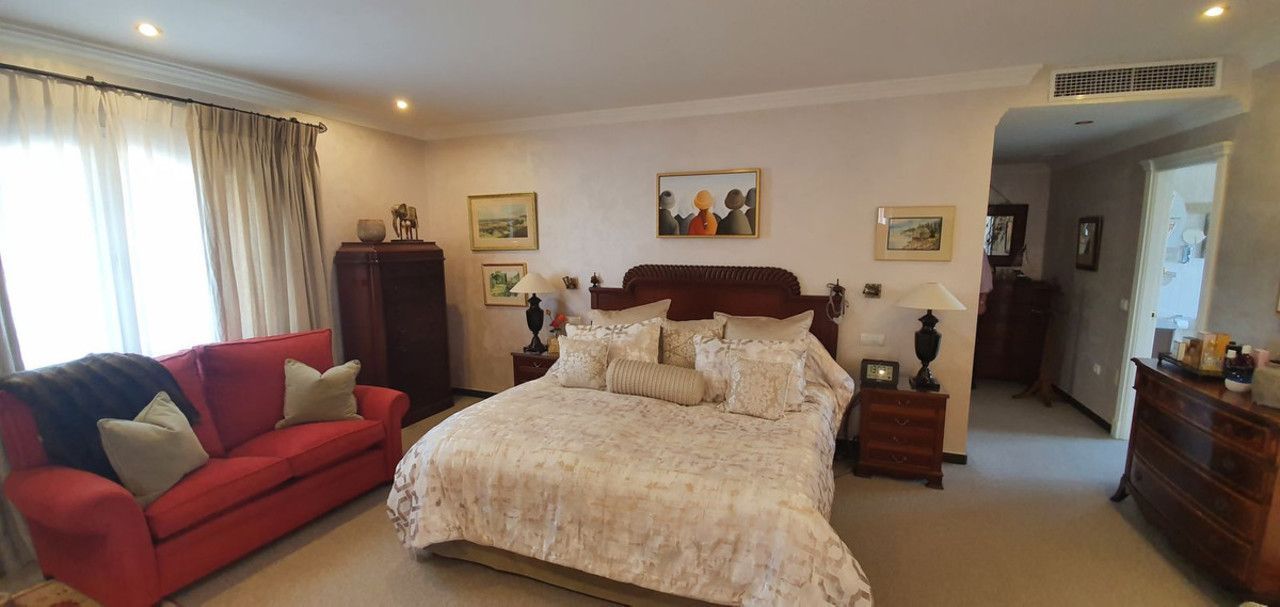Andalusian style, immaculate property in great condition. 5 bedrooms, 4 bathrooms, 1 toilet, sauna, private infinity pool overlooking the sea. Very quiet and very private area to enjoy the tranquility and atmosphere of the area. The property consists of 623 m2 built on a 10,000m2 plot. 360º view of golf, mountains, sea and more.