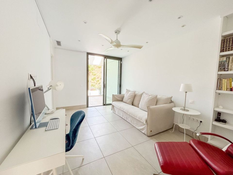 The upper floor is intended for social life and the enjoyment of the breathtaking views. Here you will find a spacious living room with high ceilings, a modern open kitchen and a large dining room that connects to a spectacular terrace, from where you can contemplate the most beautiful sunsets over the valley and the sea. It also has a guest toilet and a staircase to access the roof, where the solar panels are located.