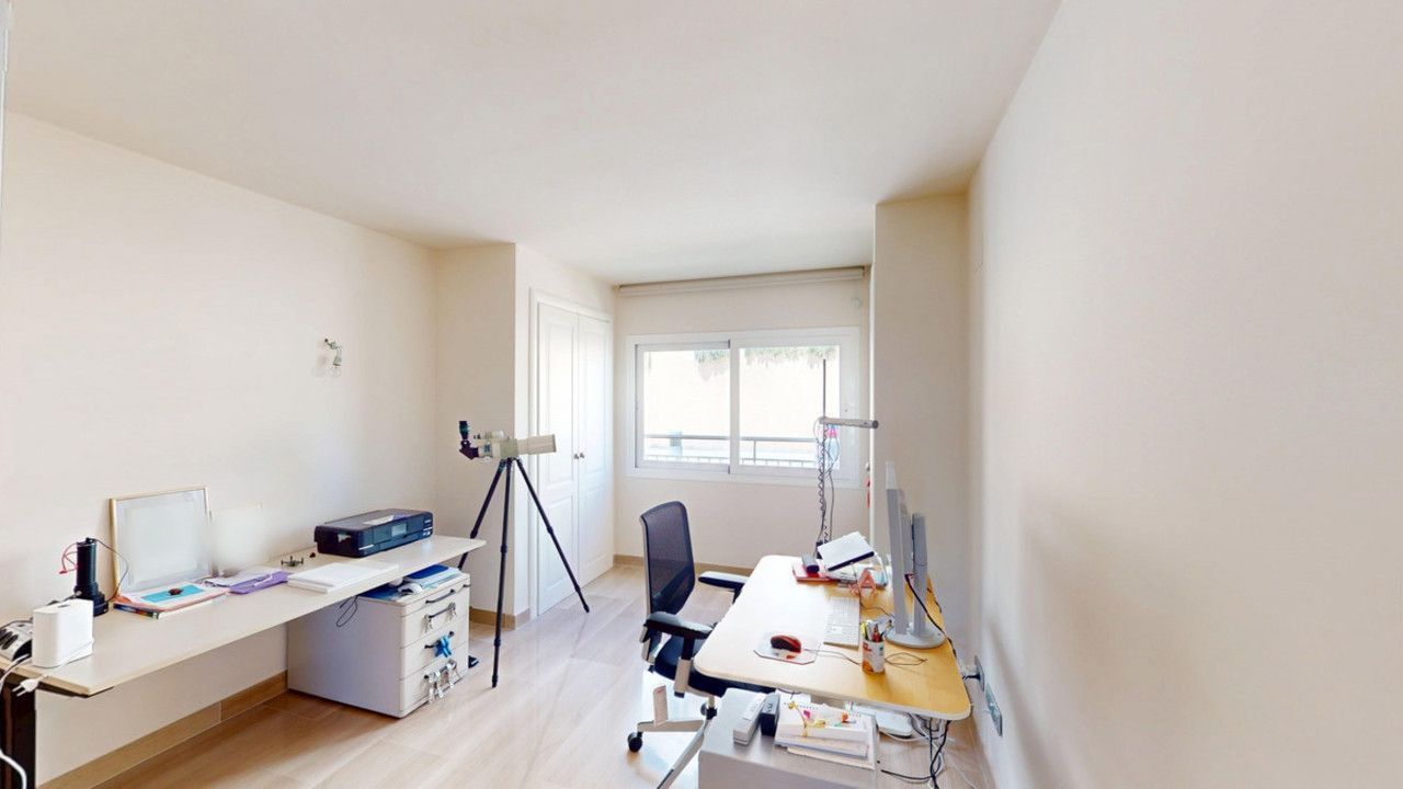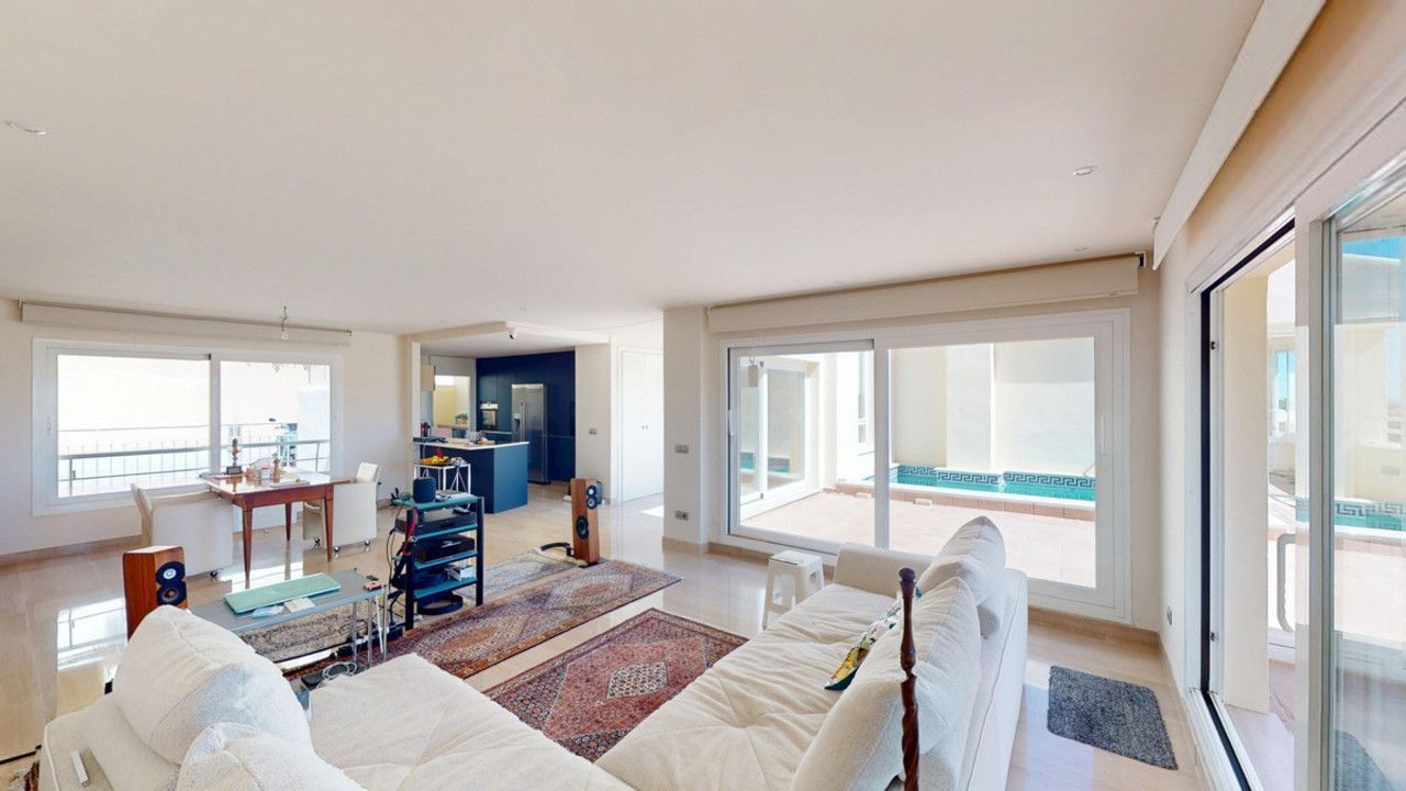 Deze moderne penthouse in Mijas, Málaga, combineert comfort en stijl op perfecte wijze. Het ligt direct aan een golfbaan en biedt een indrukwekkend uitzicht op zee, zodat je zowel kunt genieten van de rust van de green als van het panorama van de kust. De open woonruimte beschikt over vloer-tot-plafond ramen die het interieur overspoelen met natuurlijk licht en een adembenemend panoramisch uitzicht bieden op het omliggende landschap. De woonkamer is smaakvol ingericht met een grote witte hoekbank, aangevuld met kleurrijke tapijten die warmte toevoegen aan de verfijnde vloeren. De strakke, moderne keuken is voorzien van navyblauwe kasten, witte werkbladen en hoogwaardige roestvrijstalen apparatuur, wat zorgt voor een elegante en functionele kookruimte. De drei badkamers van het penthouse zijn stijlvol afgewerkt, waarvan één met een zwevende dubbele wastafel in warme houttinten en een glazen douche. De master bedroom is een oase van rust met directe toegang tot het privéterras. Deze kamer beschikt over een hemelbed, een ruime inloopkast en een luxe en-suite badkamer met zowel een bad als een douche. De tweede slaapkamer biedt eveneens een prachtig uitzicht en is ingericht met een comfortabel tweepersoonsbed. Daarnaast is er een aparte werkruimte met een moderne bureaustoel en veel natuurlijk licht. Het hoogtepunt van deze woning is het privéterras, compleet met een zwembad en een panoramisch uitzicht op de heuvels en de natuur. Verder beschikt het penthouse over twee parkeerplaatsen en twee bergingen. Bewoners kunnen ook gebruikmaken van uitstekende gemeenschappelijke voorzieningen, waaronder een groot zwembad, een verwarmd zwembad en een buitenkeuken die voor iedereen toegankelijk is. Met de doordachte indeling, luxe voorzieningen en toplocatie in Urbanización Cerrado del Águila biedt dit penthouse de perfecte balans tussen comfortabel wonen en de mediterrane levensstijl aan de Costa del Sol. We zijn blij dat we dit droomhuis binnenkort aan u mogen voorstellen, hetzij persoonlijk, hetzij via een virtuele bezichtiging. Want deze wereld is uniek - net als onze Axarquía. In Andalusië. Aan de Costa del Sol. Hier, aan de zonnige kant van het leven...