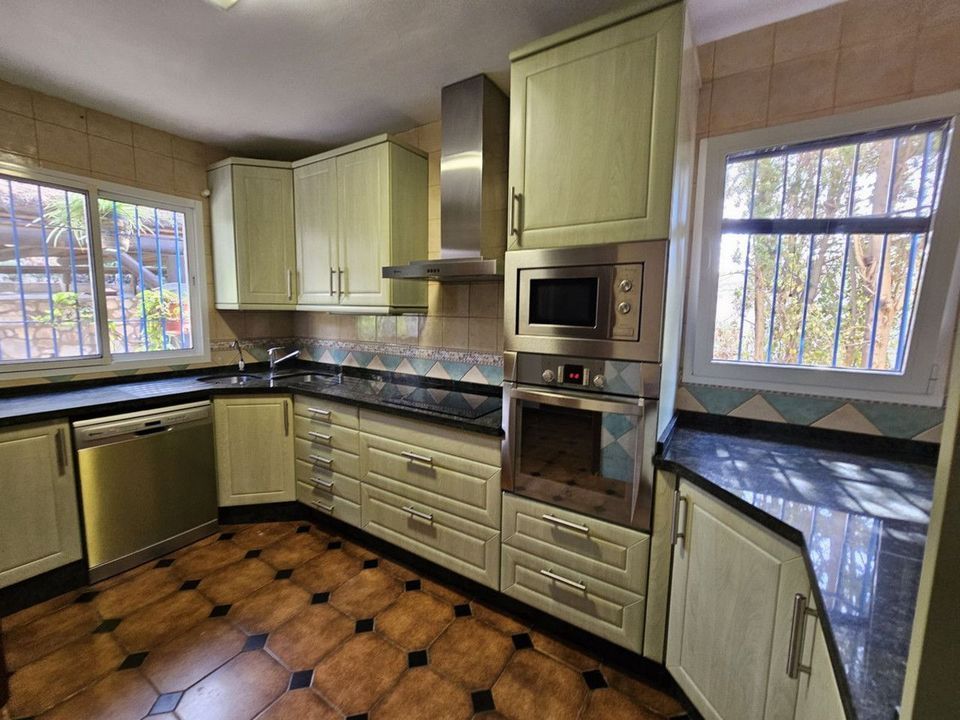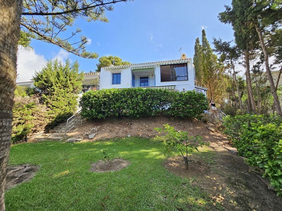 Corner townhouse with a private garden, just a stone's throw from the beach and a few minutes from Cala de Mijas. This two-story townhouse needs a touch of modernity, as it is a Mediterranean-style house built in the late 1980s. On the ground floor of the house, we find four areas: a bedroom with an en-suite bathroom, ideal for those who have difficulty navigating the stairs. A large, fully equipped kitchen, a guest toilet, a large living room divided into two parts, with a fireplace and reading area and a separate dining area, and a very pleasant terrace overlooking the magnificent green area of this development. On the ground floor, we have two bedrooms, a bathroom, and access to a garden divided into three terraces, surrounded by trees and all kinds of plants. Tranquility yet proximity to the beach with direct access from the garden.