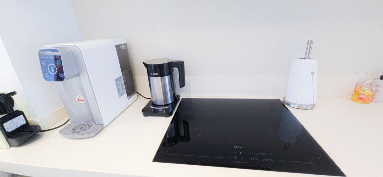 Premium Kitchen:Sleek resin worktops, high-end appliances.