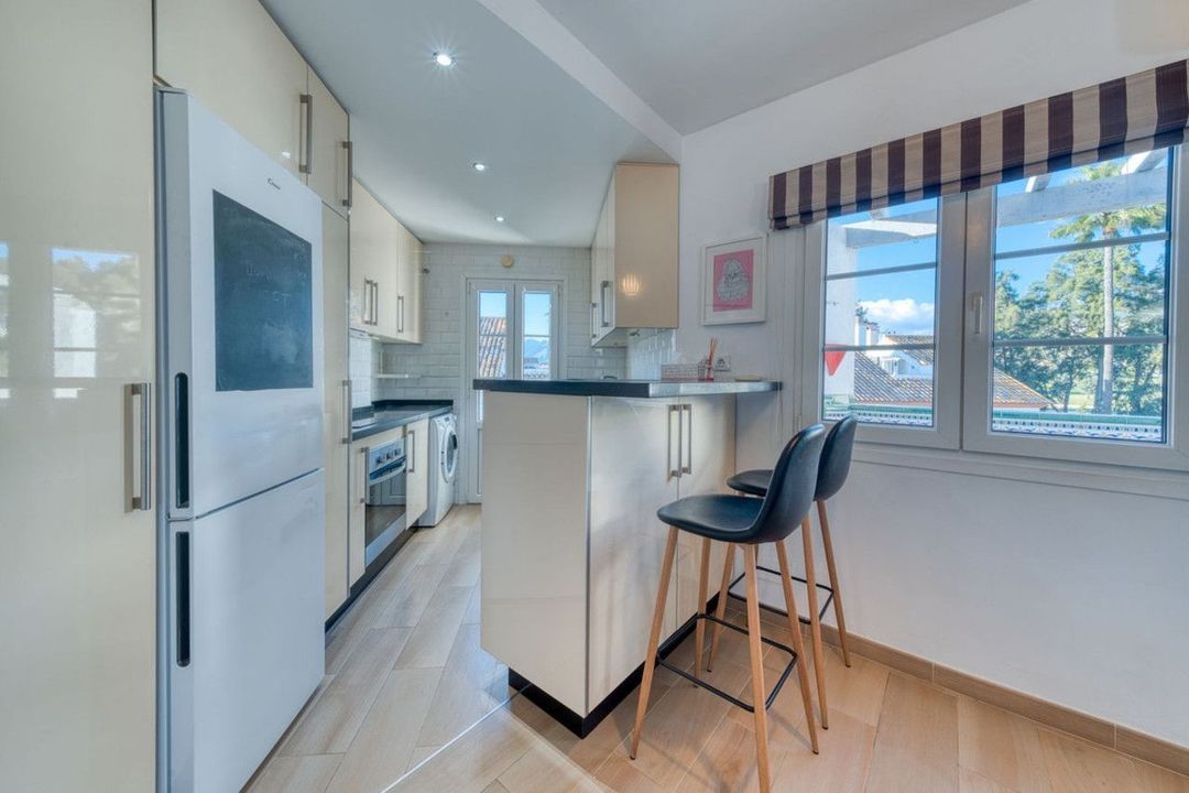 Discover this beautifully reformed frontline golf home set within a charming pueblo style community in the peaceful surroundings of Mijas Golf. Offering ninety five square metres of refined living space together with generous outdoor areas, this elegant two bedroom, two bathroom residence blends modern comfort with captivating views across the fairways. The interior has been upgraded throughout with a contemporary fully fitted kitchen, quality appliances, and stylish cabinetry that complements the warm, inviting atmosphere of the home. Tile flooring flows through each room to enhance the brightness and sense of space. The living and dining area opens directly onto a large private terrace, perfectly positioned for quiet mornings, relaxed afternoons, and golden light in the evenings while overlooking the manicured greens. This unique property is also offered with two private car parking spaces and two private storage rooms!
