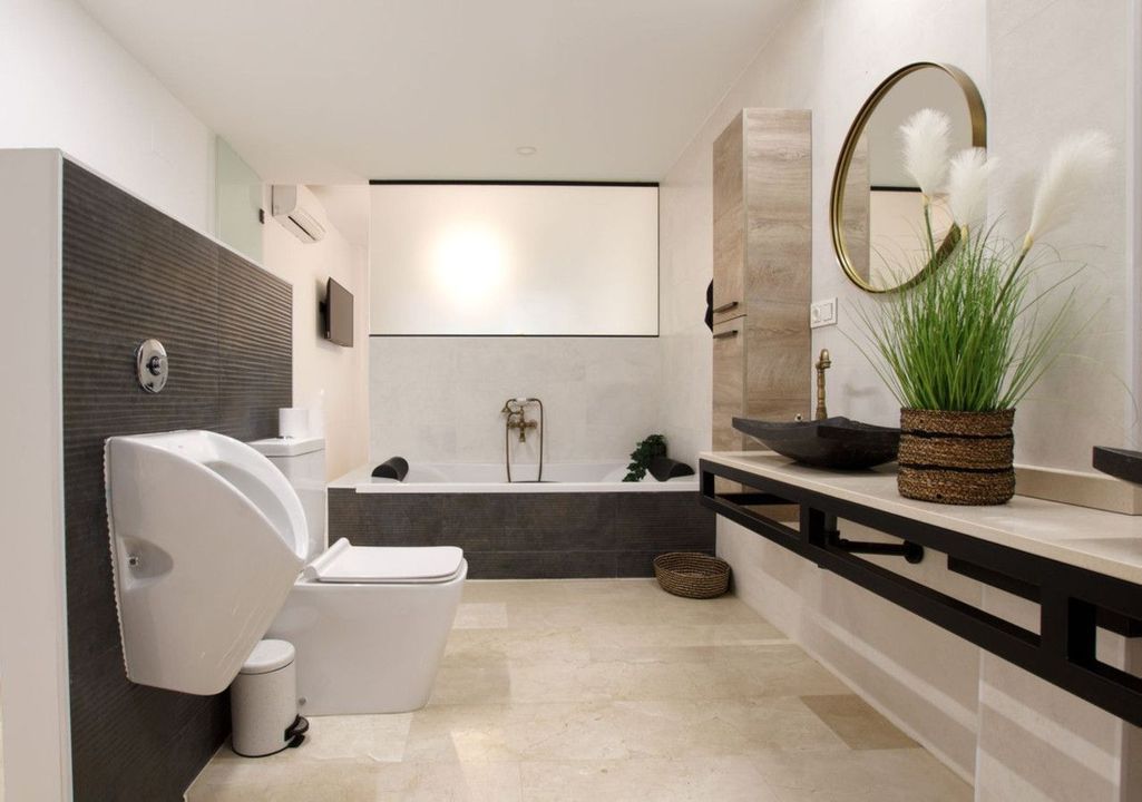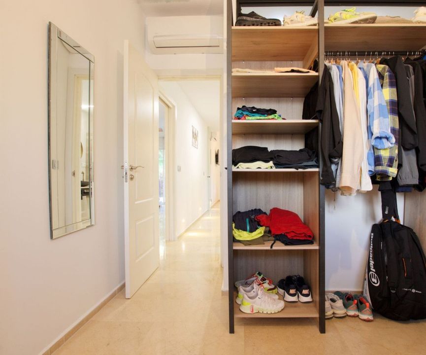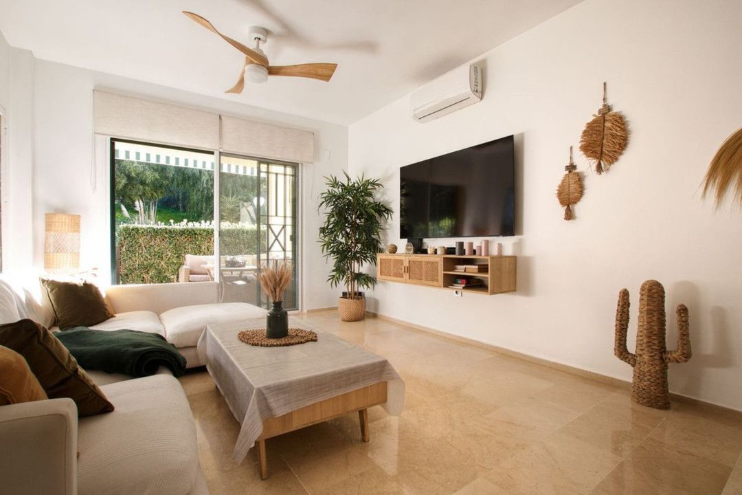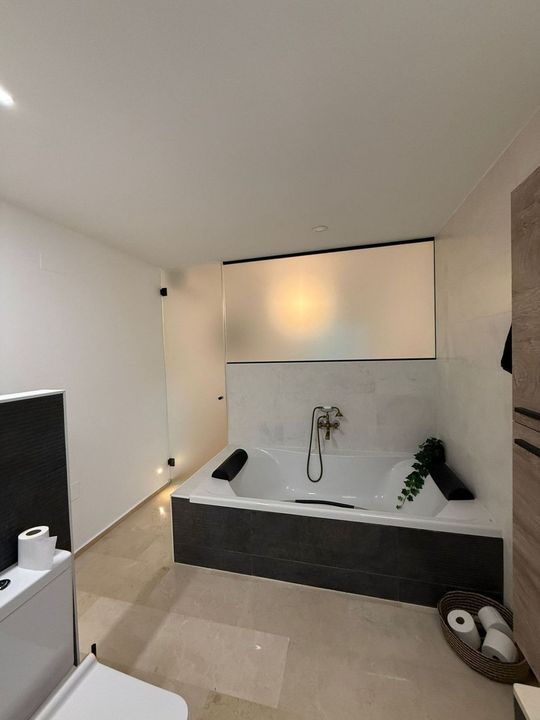 Upon entering, to the left is the open-plan kitchen, equipped with all new appliances, a window, and connected to the dining area where there is a table and 4 chairs.. Next is the spacious living room with an L-shaped sofa, hot/cold air conditioning, and access to the private covered terrace and an open section of the private garden. There are two bedrooms with windows and split-system hot/cold air conditioning. The two original bathrooms have been combined into a single, very large bathroom with a bathtub, a double shower, and a generously sized double sink area. However, it is easy to create two separate bathrooms again with drywall partitions. From the private garden, there is direct access to the communal garden and the communal swimming pool (no steps).