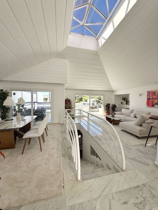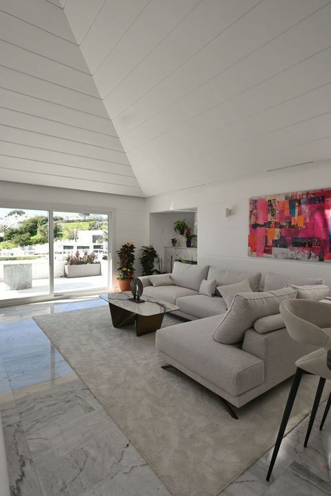 The fully equipped open-plan kitchen with separate pantry connects with a bright living room, with direct access to the private terrace and garden, enjoying open sea and nature views.