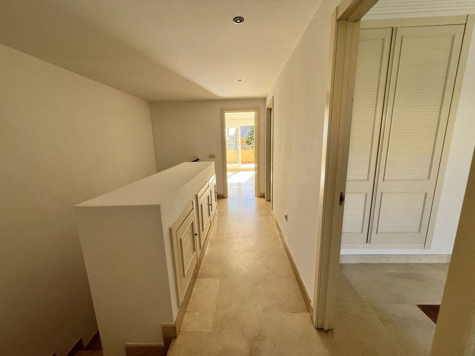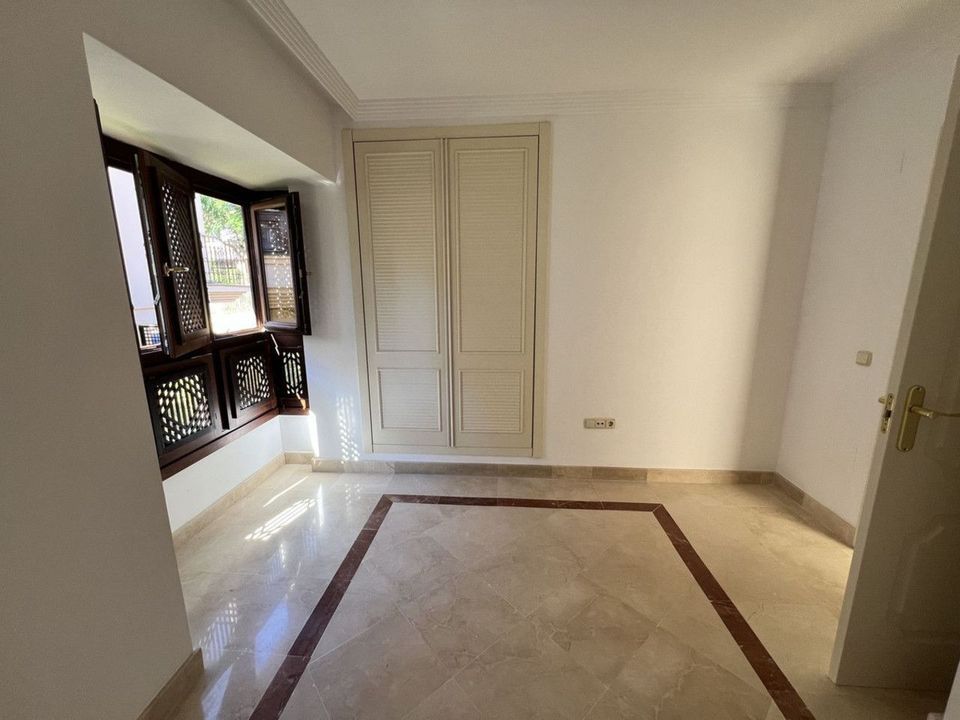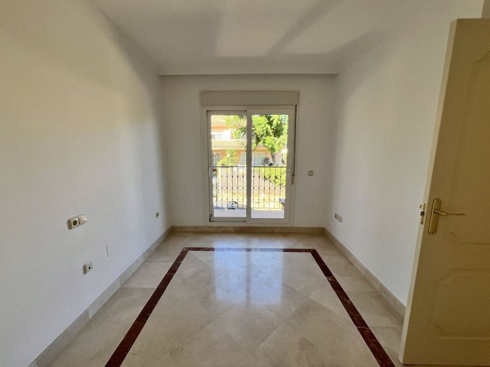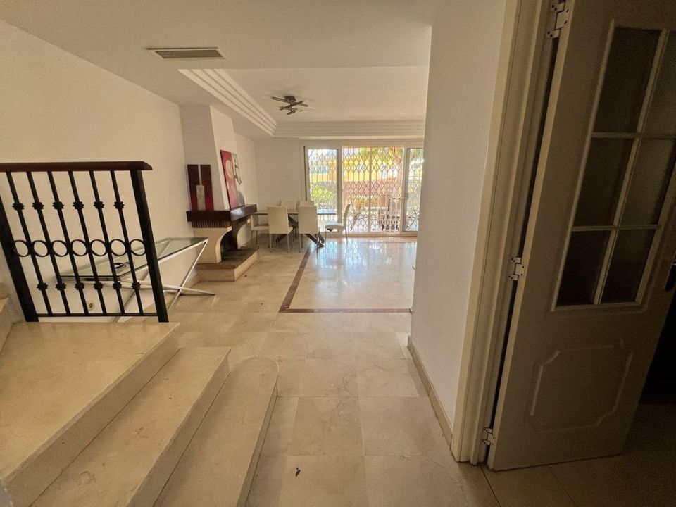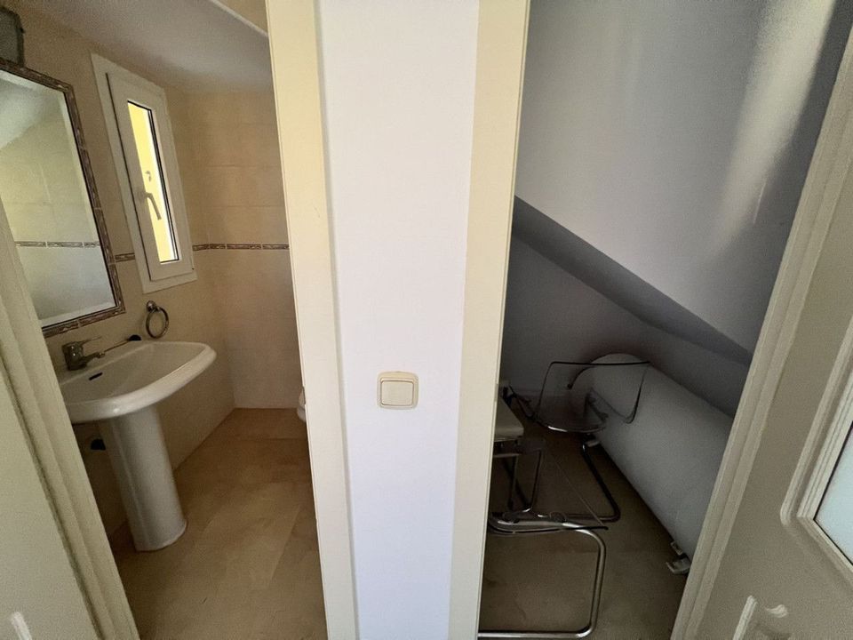On the ground floor, there is a spacious living-dining area with great natural light, an independent kitchen with the possibility of being opened up to the living room with a minor renovation, a guest toilet, and a separate utility/laundry room. The property features centralized air conditioning and marble flooring.