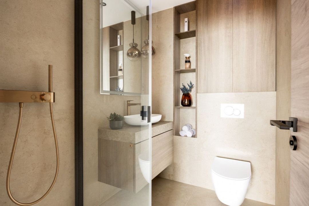 Inside, the 70 m² open-plan living, dining, and kitchen area welcomes abundant natural light, creating an atmosphere of spacious elegance. The home includes three serene bedrooms and three beautifully appointed bathrooms, with the master suite offering a designer freestanding bathtub and wall-mounted rainfall shower. Every detail reflects craftsmanship and harmony: Arklam stone countertops, a statement kitchen island, Miele premium appliances, and a built-in wine cooler complement Austrian-made furniture boards and tailor-made storage solutions. Warm Belgian flooring and Hansgrohe brushed bronze fittings add understated sophistication, while motorised curtain rails and shutters bring effortless comfort.