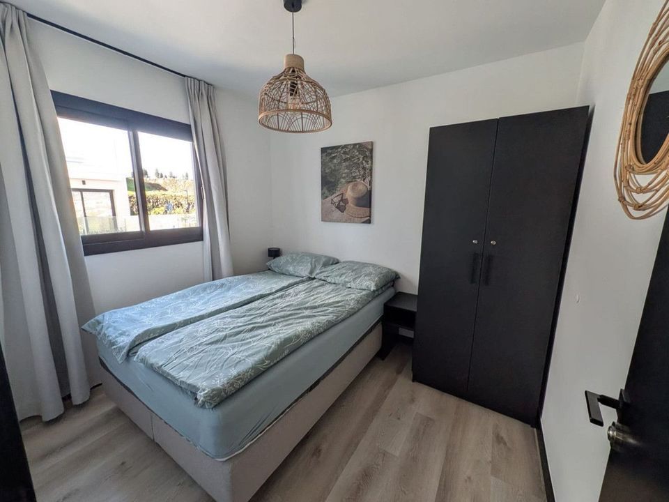 Built in 2023 and presented in excellent condition, the apartment features three bedrooms and two bathrooms, with a bright and exceptionally spacious living area that flows directly onto expansive terraces. The southwest orientation ensures abundant natural light throughout the day, while panoramic views stretch across the Mediterranean Sea, the mountains, and the beautifully landscaped gardens and pool areas.