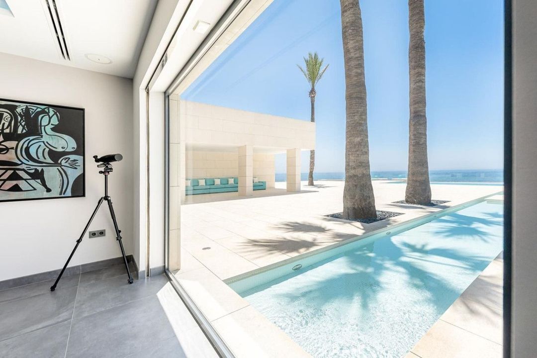 Moderne villa aan het strand met directe toegang tot een privéstrand aan de Middellandse Zee in Mijas Costa. Gelegen tussen traditionele villa's onderscheidt de woning zich door een architectuur met veel glas, strakke lijnen en een open indeling.