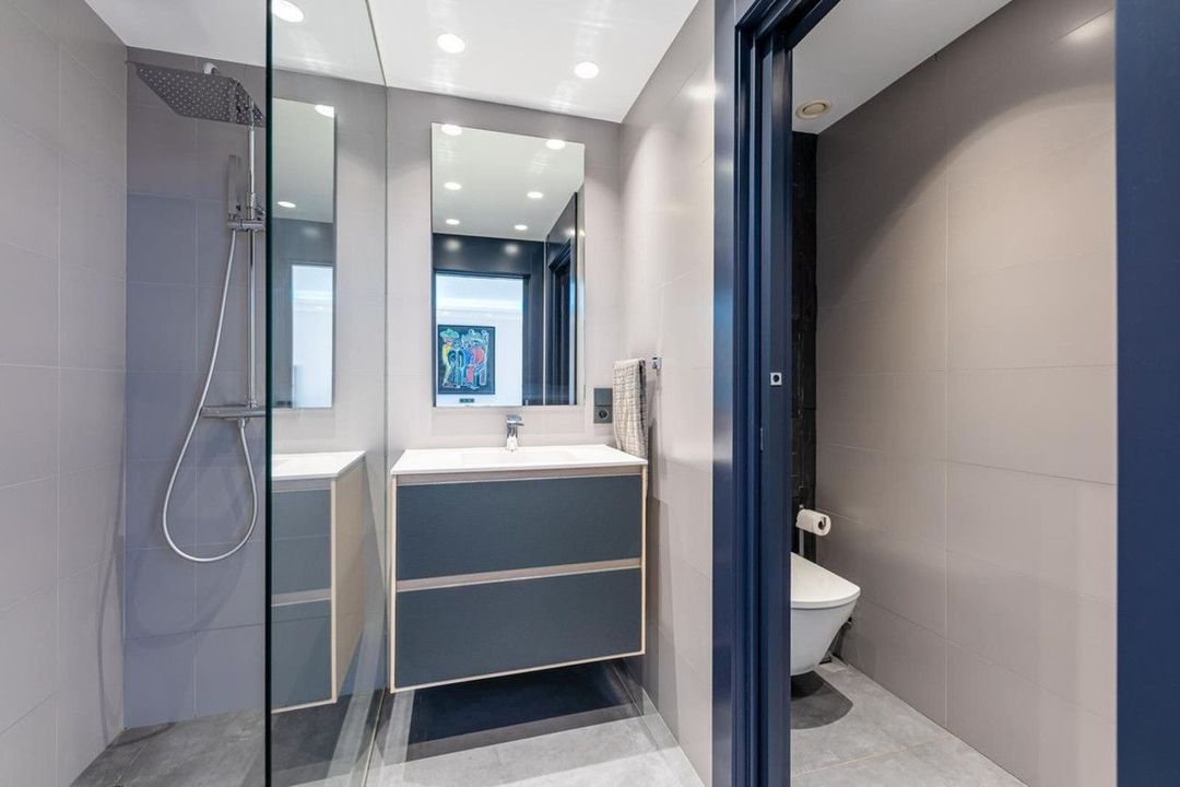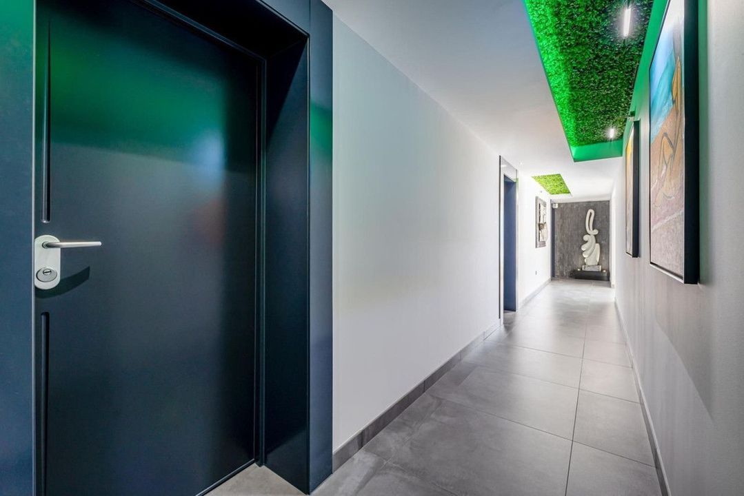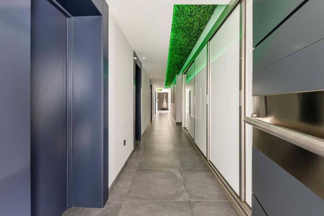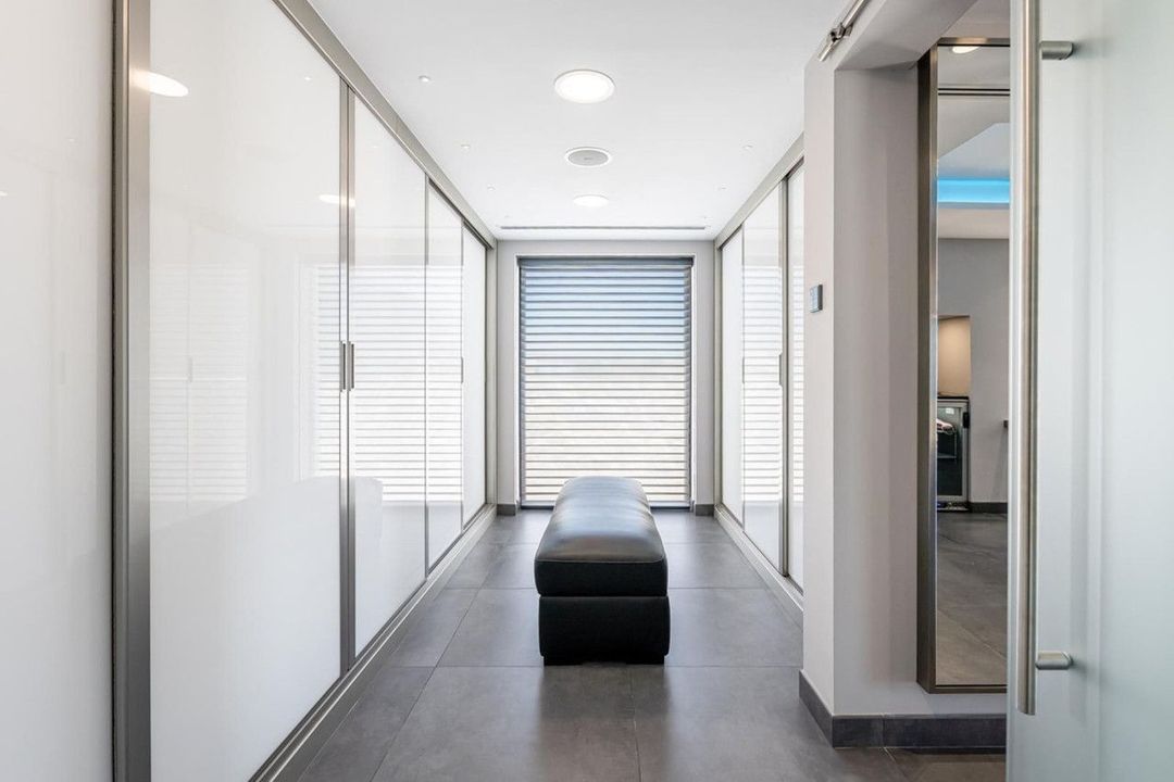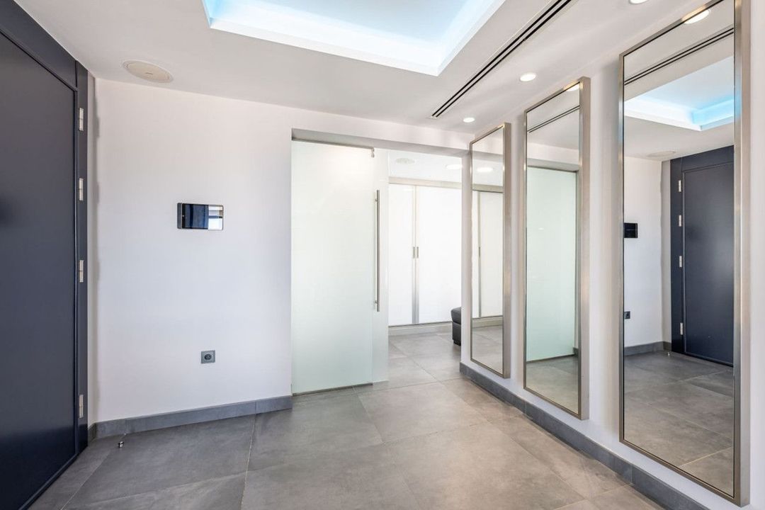 Vier slaapkamers met en-suite badkamers beschikken over een eigen domoticasysteem. De hoofdsuite omvat een sauna en Jacuzzi. Verder zijn er een kantoor, gastentoiletten, wasruimte, berging en een garage voor een maritiem voertuig naast de strandpoort.