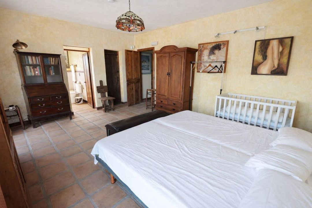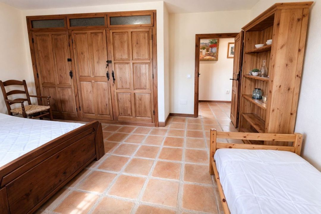 Op de bovenverdieping bevinden zich vier slaapkamers en drie badkamers, waaronder een royale master suite met een ruime en-suite badkamer en toegang tot een groot privéterras. Vanuit hier omlijsten erkerramen het weidse uitzicht over het land en het omliggende landschap, wat het gevoel van ruimte en sereniteit versterkt.