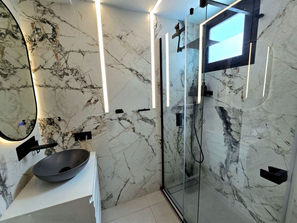 Impressive solarium on the upper floor, featuring a full bathroom and outdoor shower, perfect as an exclusive chill-out area.