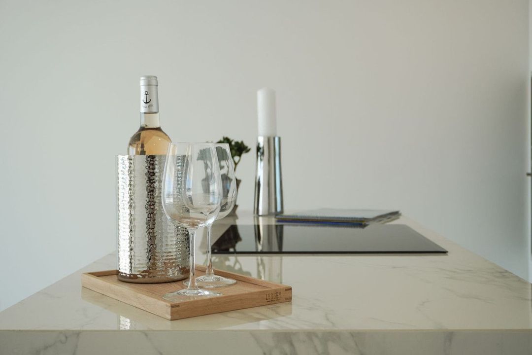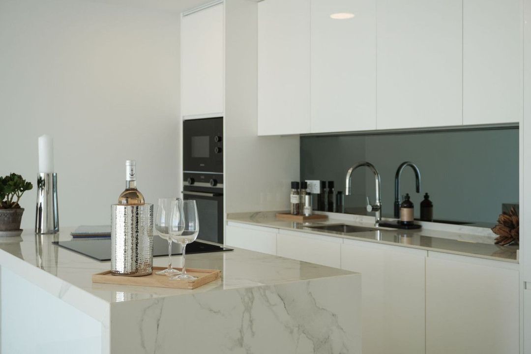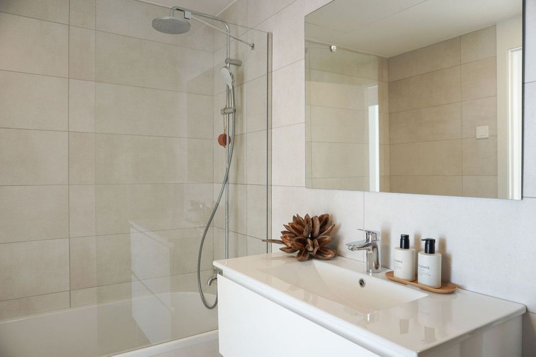 Het appartement beschikt over een lichte en ruime woonruimte die naadloos overgaat in de open keuken, uitgevoerd in een elegante, minimalistische stijl en voorzien van geïntegreerde apparatuur. Grote raampartijen laten overvloedig daglicht binnen en creëren in de hele woning een warme en aangename sfeer.