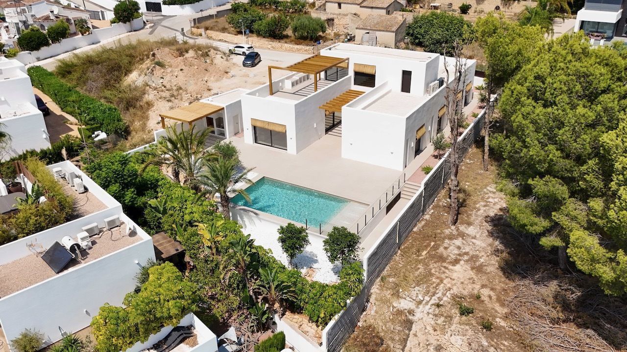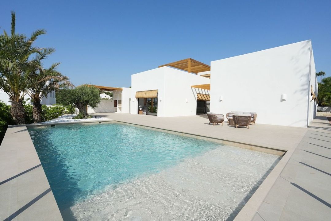 Deze prachtige villa in Ibiza-stijl wordt in februari 2025 afgebouwd met materialen van de hoogste kwaliteit.