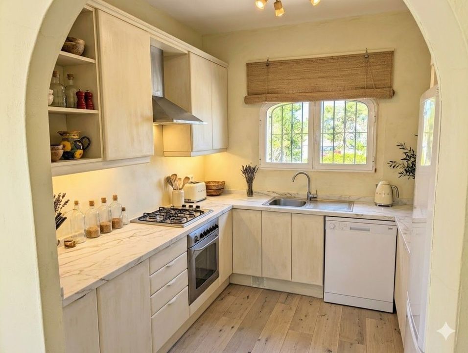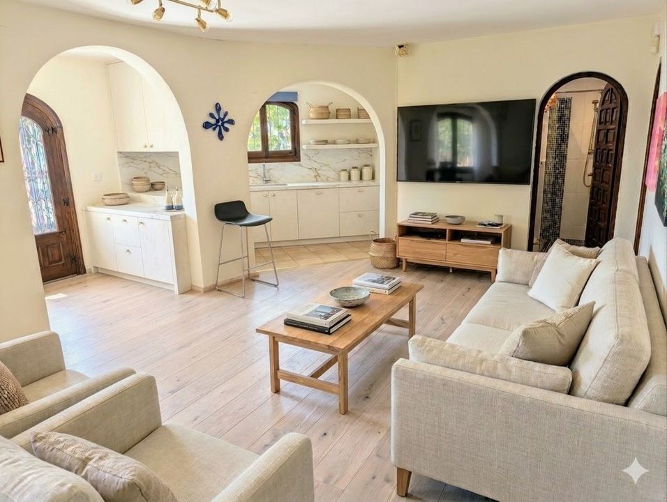 Minimalistisch exterieur: Transformeer de traditionele gevel met glad wit pleisterwerk en lichte houtaccenten.Naadloze overgangen: Vervang gedateerde tegels door lichte plankenvloeren en werkbladen van natuurlijk marmer voor een luchtig, organisch gevoel.Natuurlijke texturen: Vervang zwaar steenwerk door handgesmeerd pleisterwerk voor een serene, spa-achtige sfeer binnenshuis.