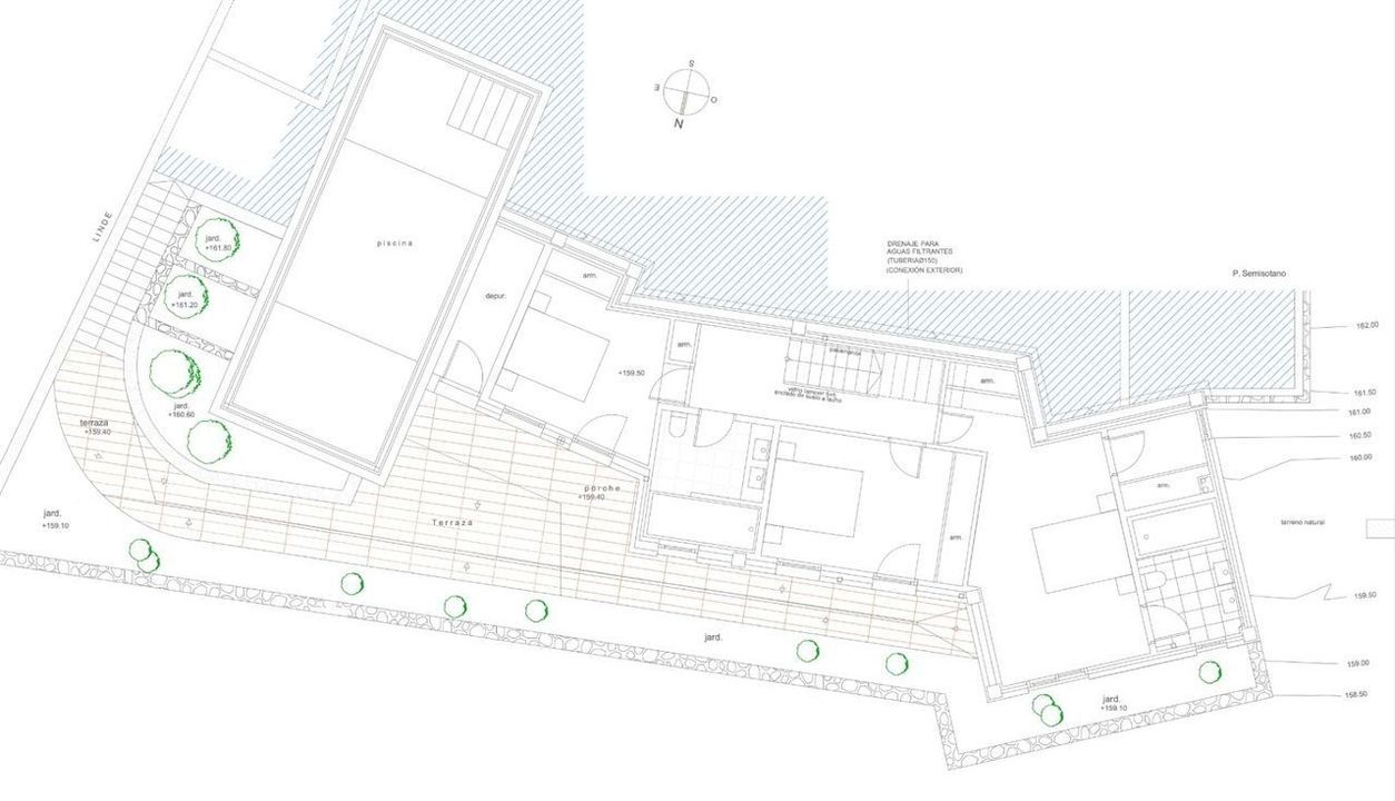 De woning is verdeeld over twee niveaus die harmonieus in het landschap zijn geïntegreerd, wat zorgt voor optimale privacy.