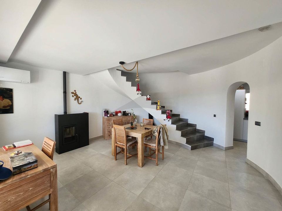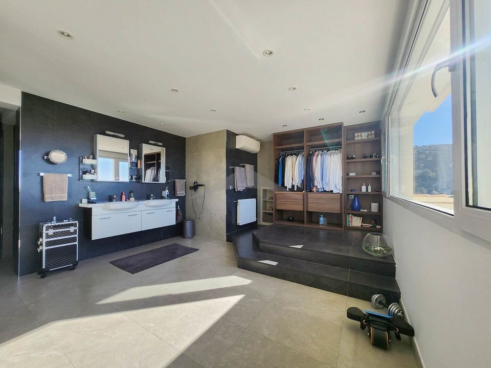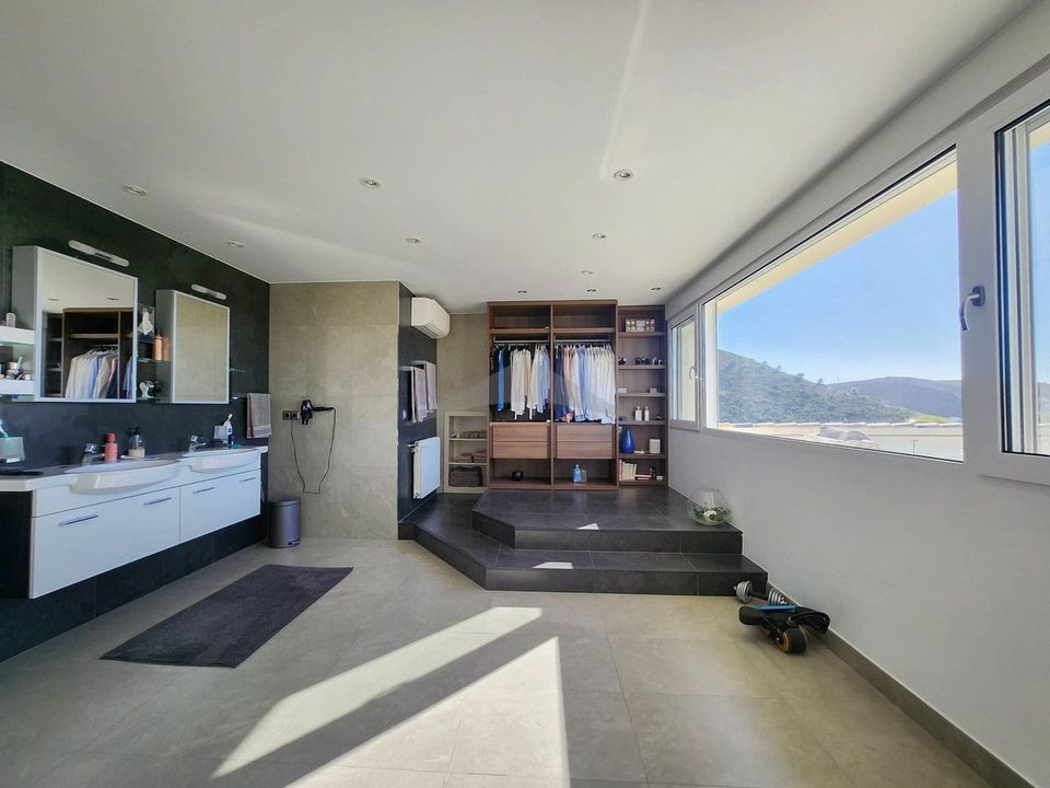 Op de verdieping biedt de master suite een uitzonderlijk privéverblijf met een ruime dressing, een complete badkamer, vloerverwarming, split-airconditioning en een privéterras met zeezicht.