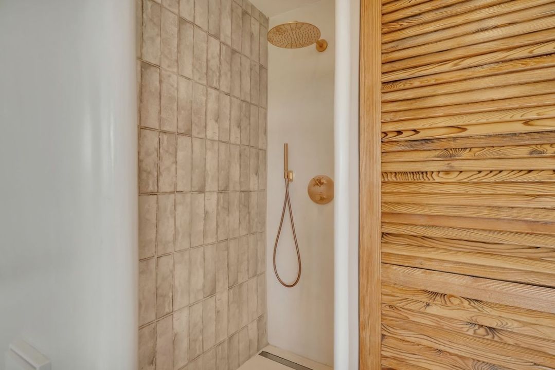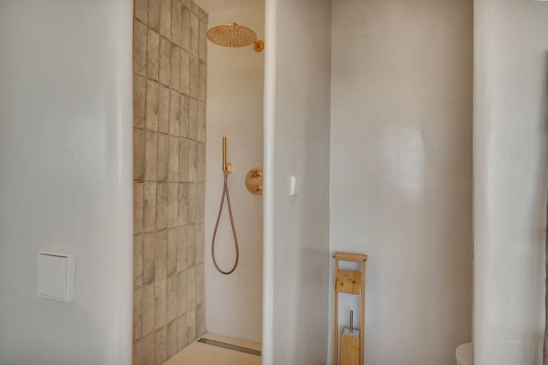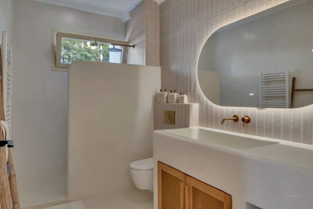 De hoofdverdieping beschikt over een ruime slaapkamer met ingebouwde kasten en een stijlvolle en-suite badkamer in microcement. Op de bovenverdieping bevinden zich nog twee slaapkamers met elk een eigen badkamer in microcement en een overloop ruimte. De master bedroom geniet van panoramisch zeezicht, een open badkamer met vrijstaand bad, dressing en een privé overdekt terras.Vanuit elke slaapkamer heeft men zicht op zee.