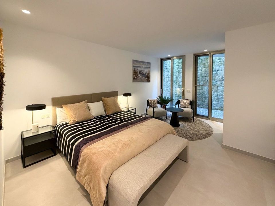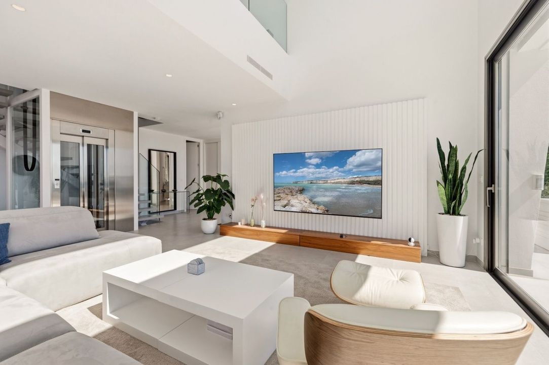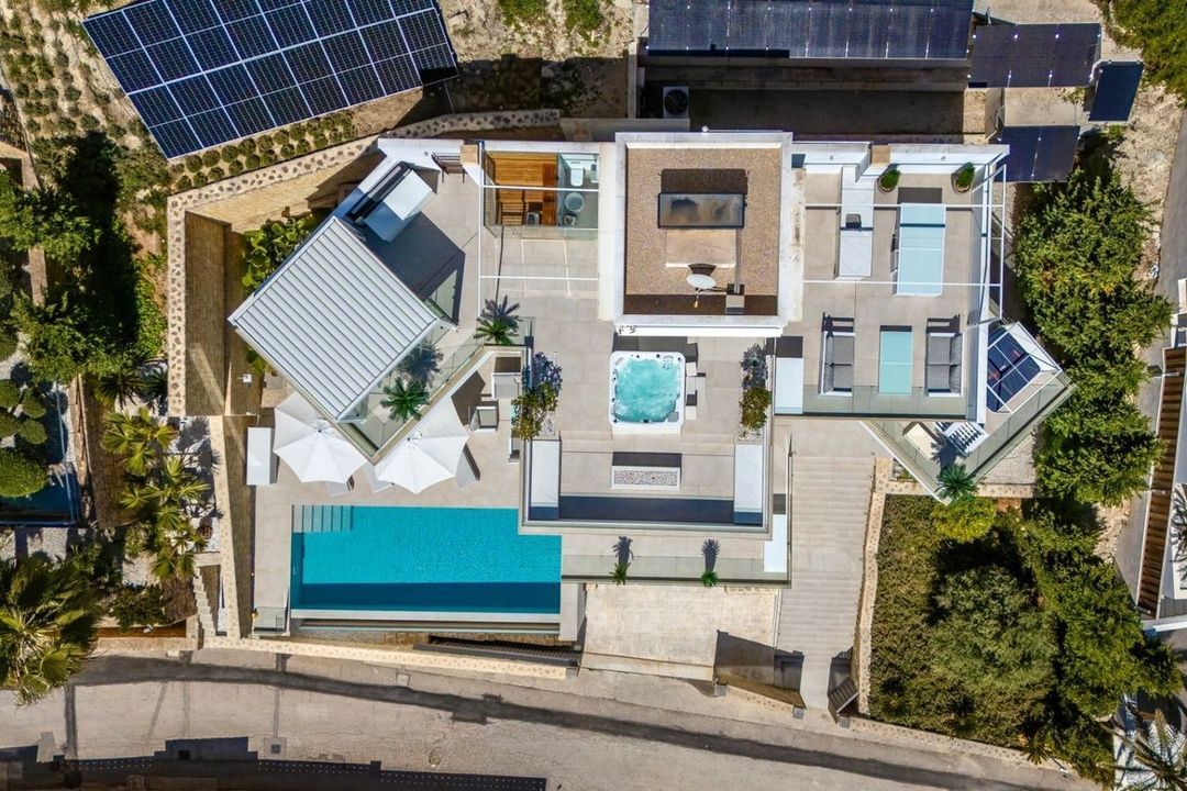 Het beschikt over 4 slaapkamers, allemaal met en-suite badkamers, en een gasten toilet. Het huis is verspreid over drie verdiepingen met een lift en omvat een woonkamer, eetkamer en keuken, evenals een buitenkeuken. Er is een verwarmd infinity zwembad van 38 m², een tuin, een garage voor twee auto’s en extra parkeerplaats buiten.