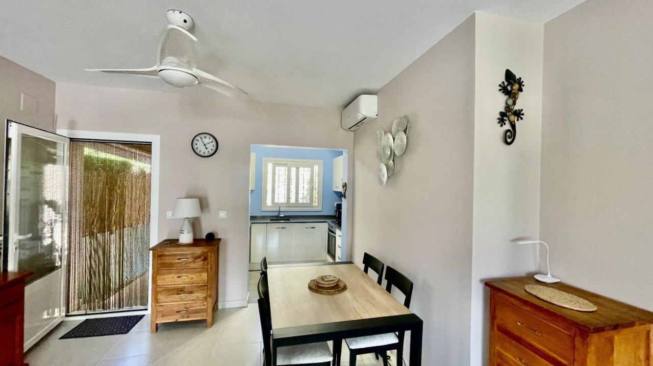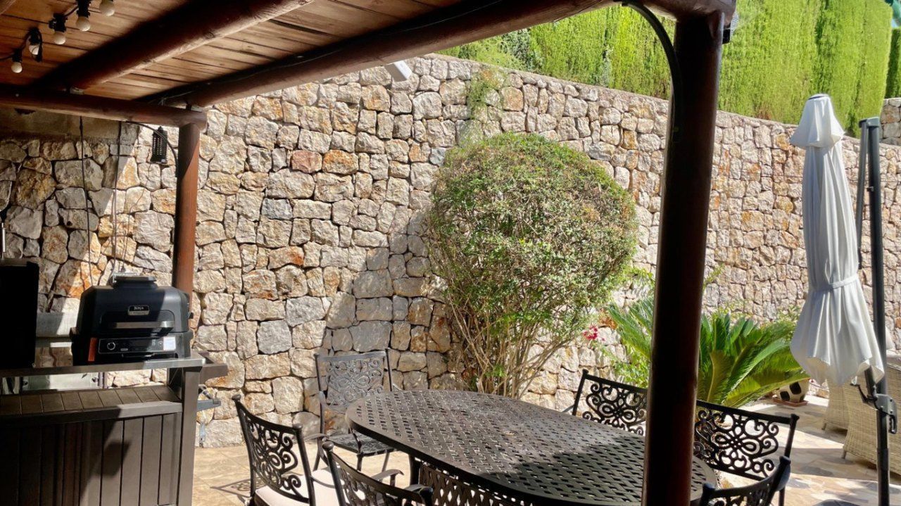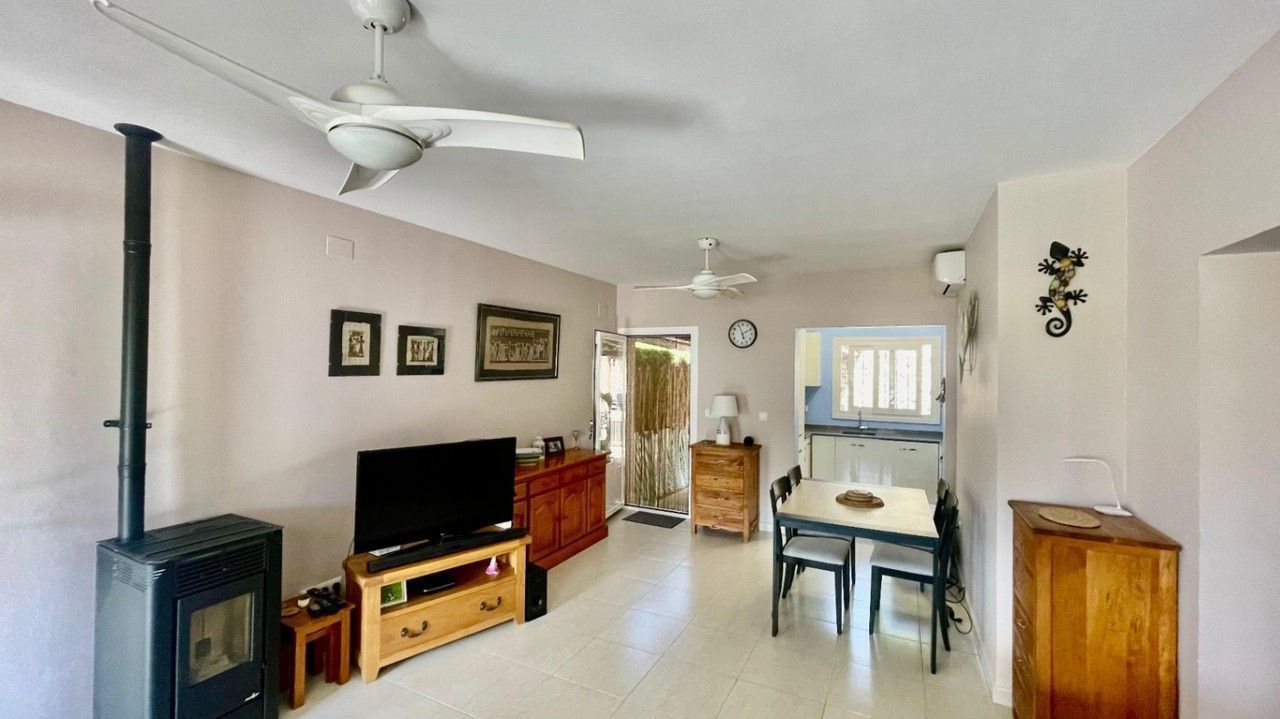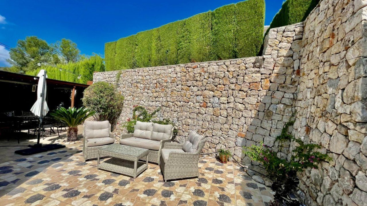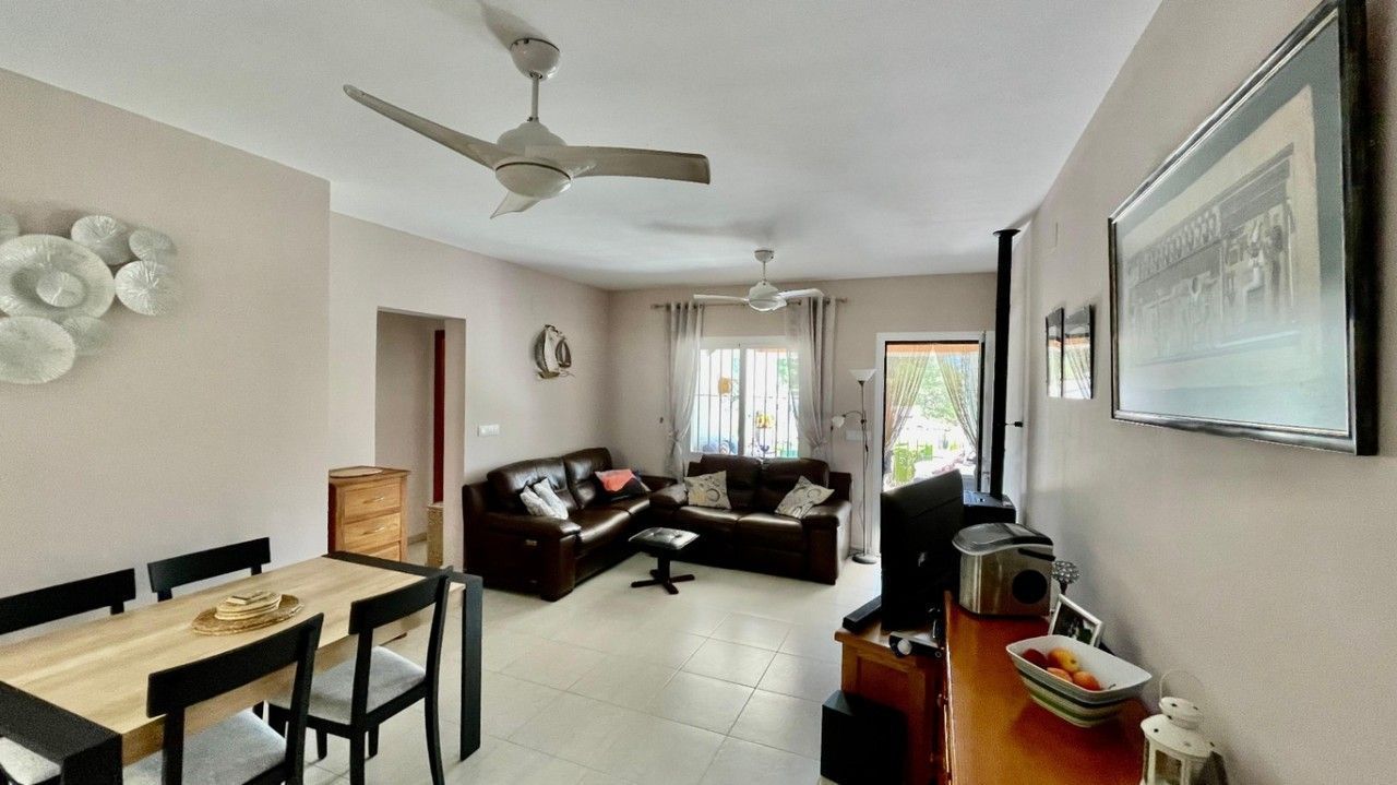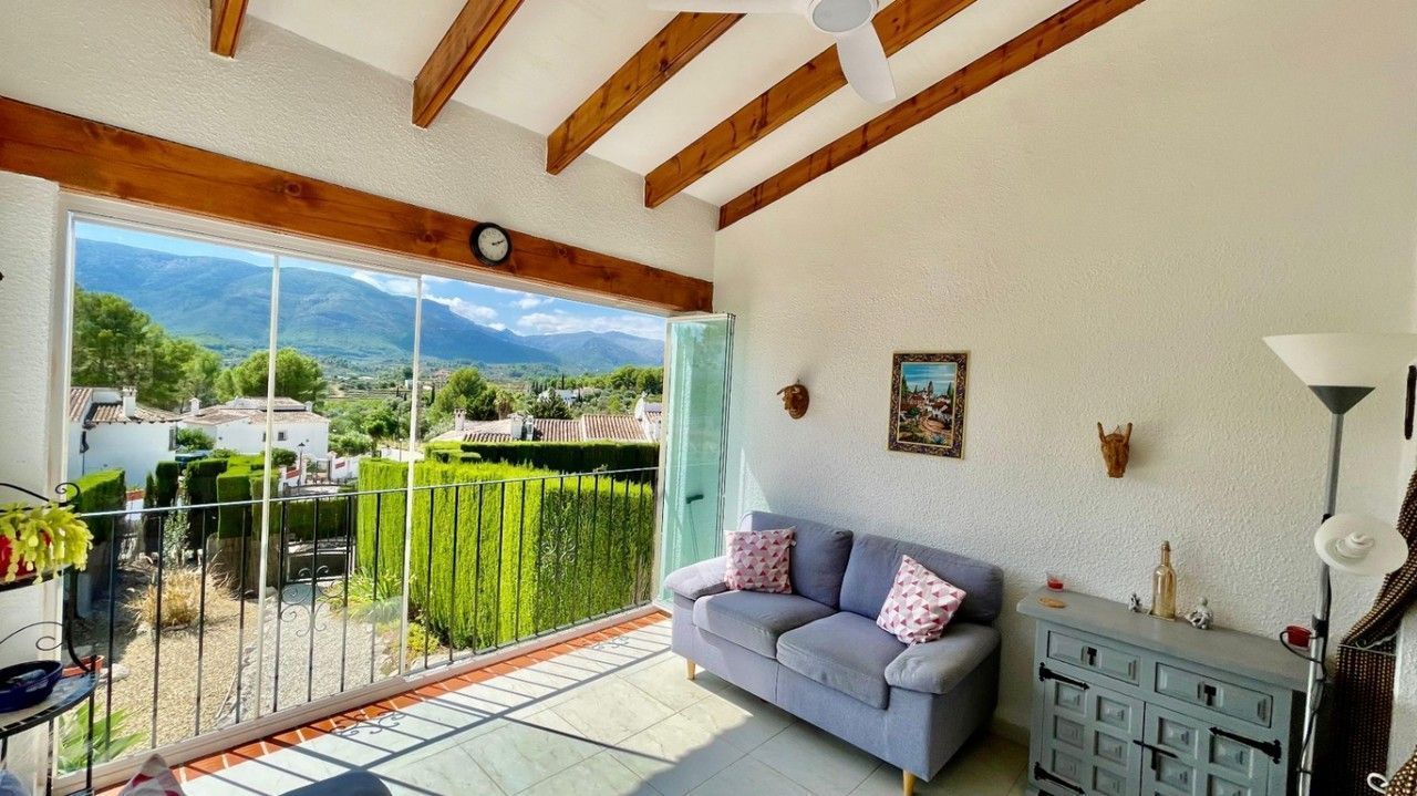 Een onberispelijke, op het zuiden gelegen luxe halfvrijstaande villa met een spectaculair uitzicht op de bergen en de vallei, gelegen in een gewilde, goed onderhouden urbanisatie. De woning is onlangs gerenoveerd en beschikt over een lichte naya met glazen gordijnen en hoge houten balkenplafonds, een ruime open woon- en eetkamer met pelletkachel, airconditioning en plafondventilatoren, plus een volledig ingerichte luxe keuken die uitkomt op een privé terras met houten pergola, droogstenen muren - perfect voor het ontvangen van gasten. De villa heeft twee tweepersoonsslaapkamers met inbouwkasten, airconditioning, plafondventilatoren en een stijlvolle inloopdouche. Andere hoogtepunten zijn nieuwe dubbele beglazing, energiezuinige zonneboiler, een opslagruimte onder de villa, een beveiligde, onderhoudsvriendelijke tuin op het zuiden en parkeergelegenheid op eigen terrein. Bewoners hebben toegang tot een prachtig onderhouden gemeenschappelijk zwembad met faciliteiten. De woning ligt op loopafstand van een populair restaurant, op slechts enkele minuten van Orba, Jalon en Murla, en op korte rijafstand van de stranden van Denia, Javea, Moraira en Calpe. Deze gemakkelijk bereikbare woning moet u gezien hebben om de vele bijzondere kenmerken en het prachtige uitzicht over de Jalon-vallei te kunnen waarderen.