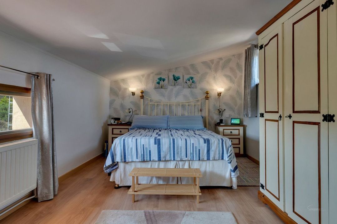The entrance hallway is a lovely, welcoming reception room which leads to the living spaces. The open aspect, fully equipped kitchen and living room has a warm, cozy feel and benefits from central heating and a free standing, pellet burner. From here, there is a separate dining room which opens into a lounge with fabulous, floor to ceiling, sliding doors. This brings the outside in, with stunning views across the garden, and swimming pool and out to the surrounding countryside. The living spaces are flooded with natural light, thanks to the large windows and glass doors, yet the character of the home has been cleverly retained with beautiful original features.