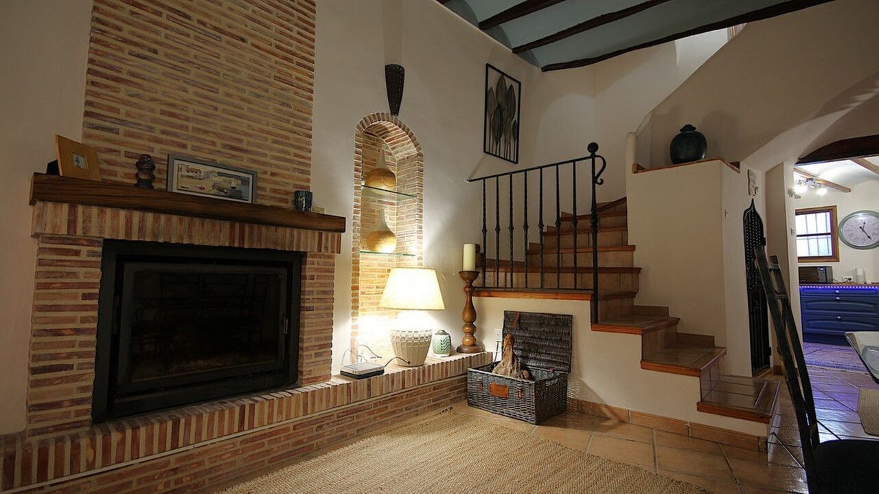 On the main floor, there is a warm and welcoming entrance hall that leads to a spacious and cozy living-dining room, complete with a feature fireplace. This lovely room has some beautiful, traditional features, such as wooden beams and vintage Spanish doors.