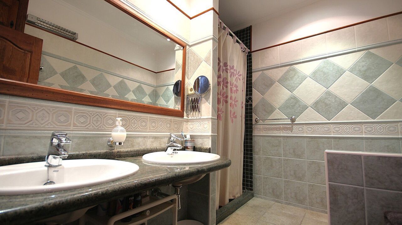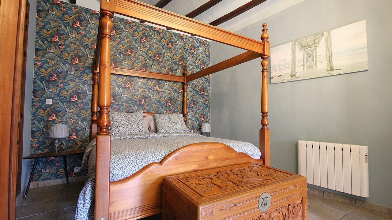 The impressive internal staircase leads to a spacious double bedroom with views of the surrounding mountains. Continuing up the stairs, you will reach the first floor, which features a large family bathroom with a double sink. The master bedroom is spacious and bathed in natural light.