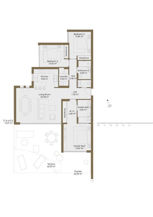 The apartment offers three spacious bedrooms and 2 bathrooms, including a master suite with a walk-in wardrobe and direct access to the terrace, and a guest toilet. Finished in a warm and natural palette, the interiors combine textured walls, oak elements and stone details to create a refined yet welcoming atmosphere.